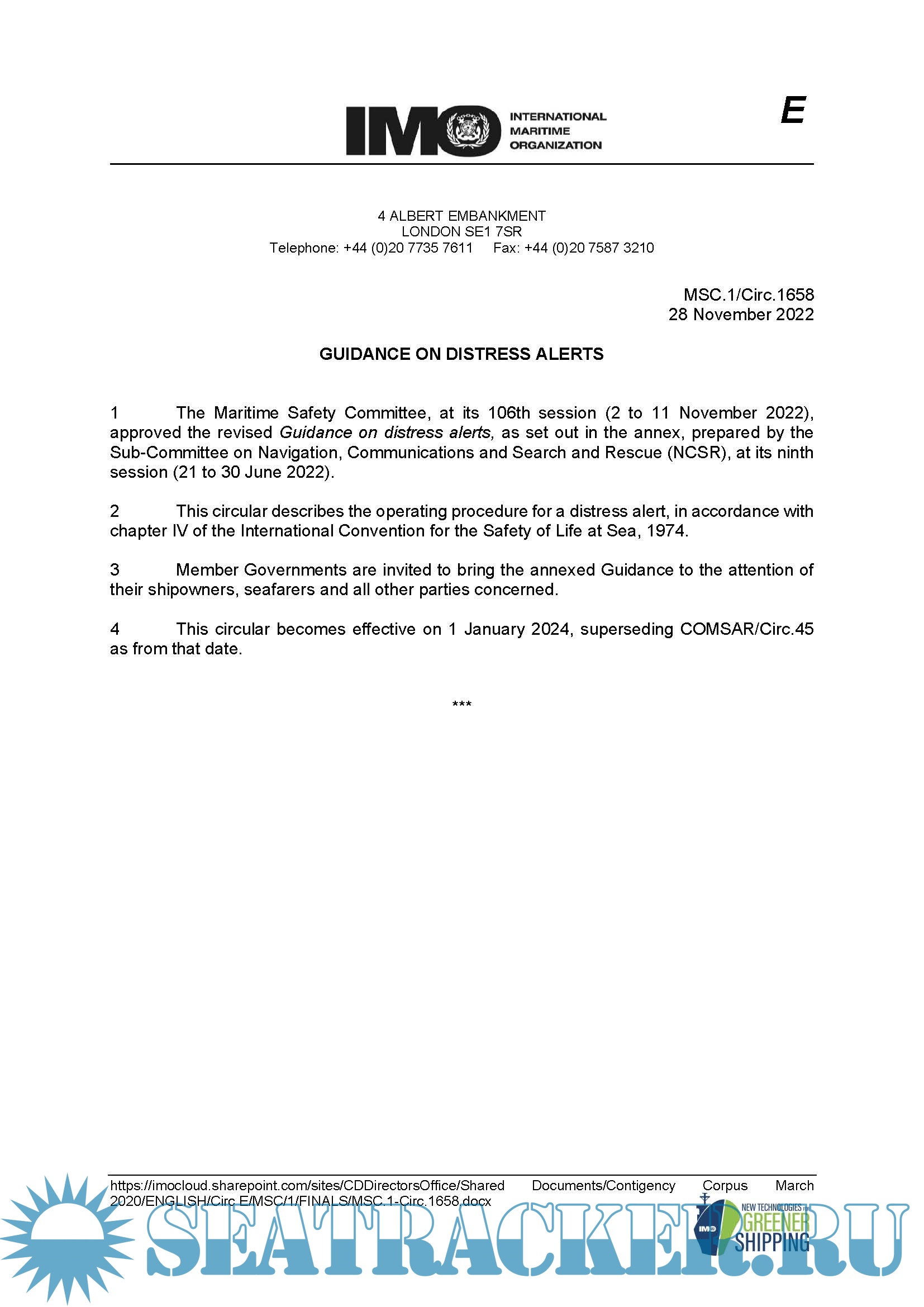 Description: The Maritime Safety Committee, at its 106th session (2 to 11 November 2022), approved the revised Guidance on distress alerts, as set out in the annex, prepared by the Sub-Committee on Navigation, Communications and Search and Rescue (NCSR), at its ninth session (21 to 30 June 2022).
