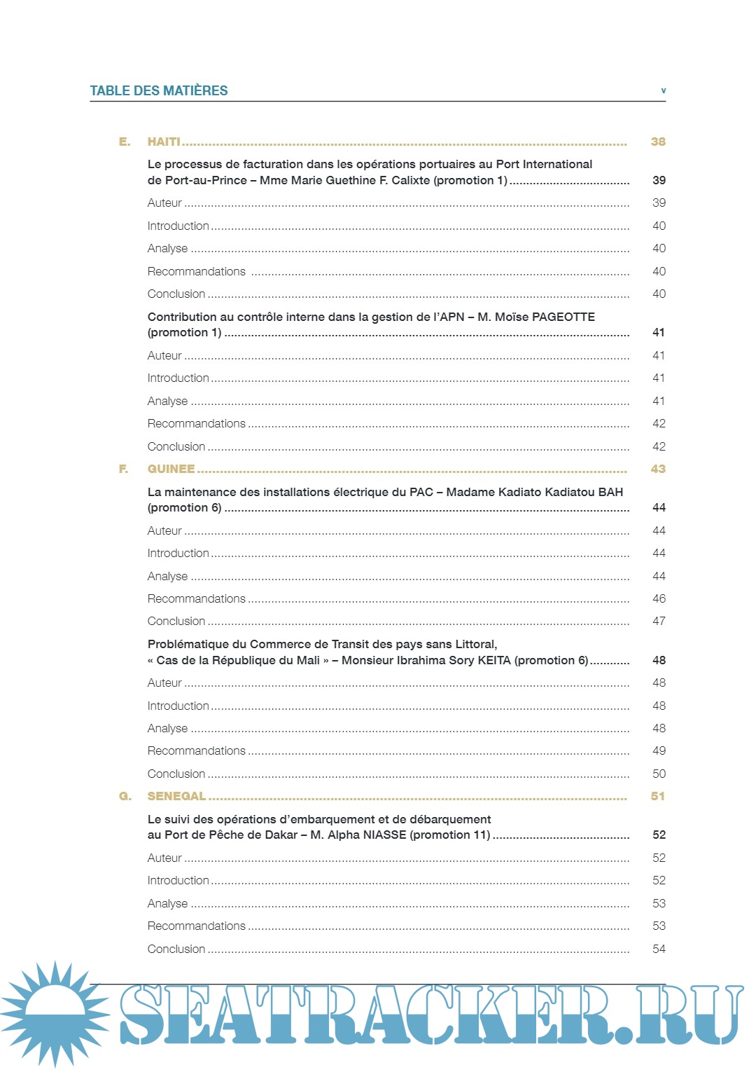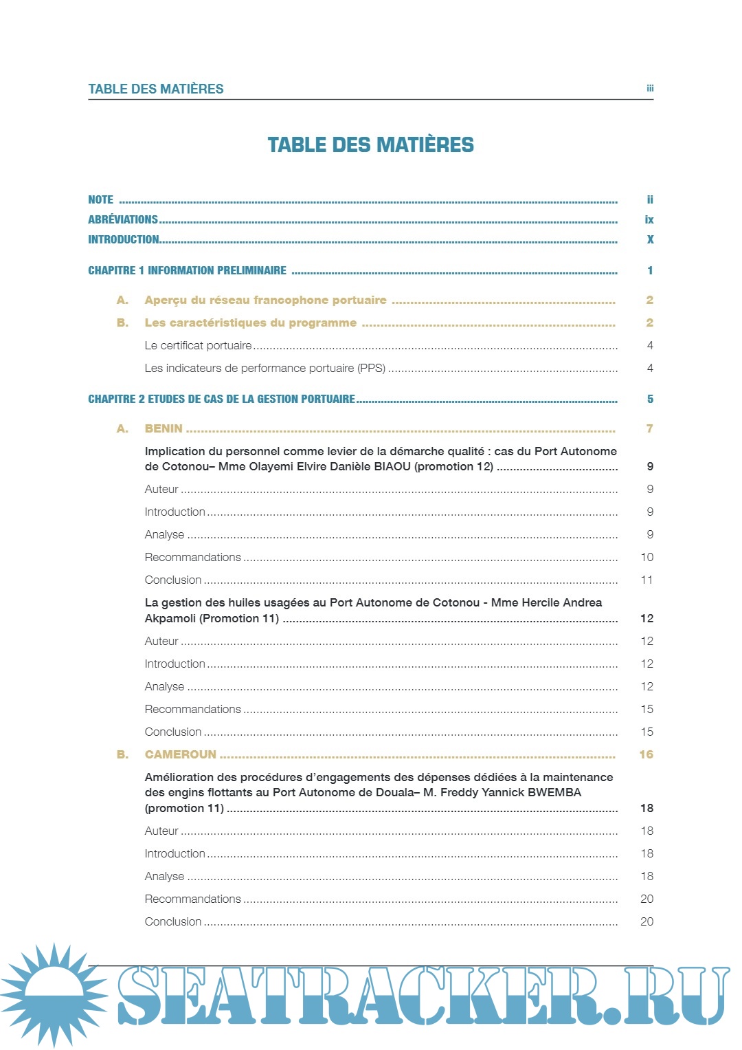 Description: Cette publication a été produite dans le cadre des activités du Programme de Gestion Portuaire TrainForTrade de la CNUCED. Elle a été financée par les ports du Bénin, Cameroun, Côte d’ivoire, Gabon, Guinée, Haïti, Sénégal et Togo. Ce projet a aussi reçu le soutien des grands ports maritimes de Nantes Saint-Nazaire et de Marseille- Fos (France). Les résumés des études de cas soumis par les participants de la formation composant cette publication ont été préparés par Elodie Bardin et Carine Fabre de l'institut de formation du Port de Marseille-Fos, Dominique Chantrel et Guillaume Marneffe, membres du personnel de la CNUCED, le tout encadré par Mark Assaf, Chef de la Section du développement des ressources humaines/TrainForTrade, sous la supervision de Geneviève Féraud, Chef du Service du développement des connaissances, et Shamika N. Sirimanne, Directeur de la Division des Transports et de la Logistique. Dans la présente publication, les termes pays/économie désignent, selon le cas, des territoires ou des zones. Les appellations employées et la présentation des données n’impliquent de la part du Secrétariat de l’Organisation des Nations Unies aucune prise de position quant au statut juridique des pays, territoires, villes ou zones ou de leurs autorités, ni quant au tracé de leurs frontières ou limites. La mention d’une société et de ses activités ne doit pas être interprétée comme une marque de soutien de la part de la CNUCED à cette société ou à ses activités. Le texte de la présente publication peut être cité ou reproduit, sous réserve qu’il soit fait mention de la source et qu’un exemplaire de la publication où sera reproduit l’extrait cité soit communiqué au secrétariat de la CNUCED. Le présent document n’a pas fait l’objet d’une relecture par les services d’édition.