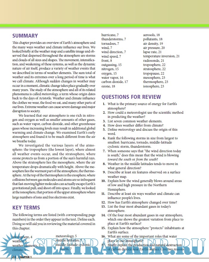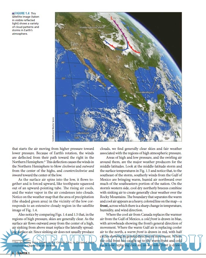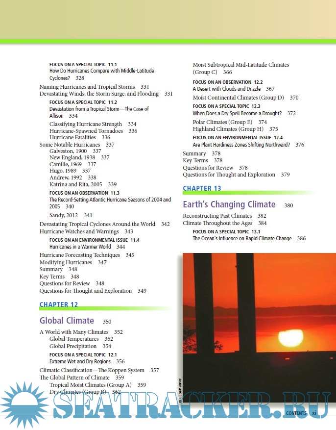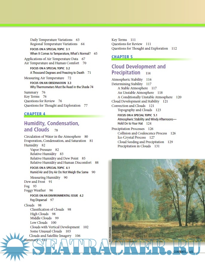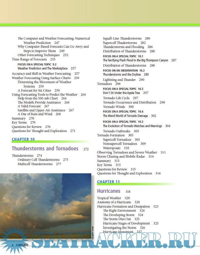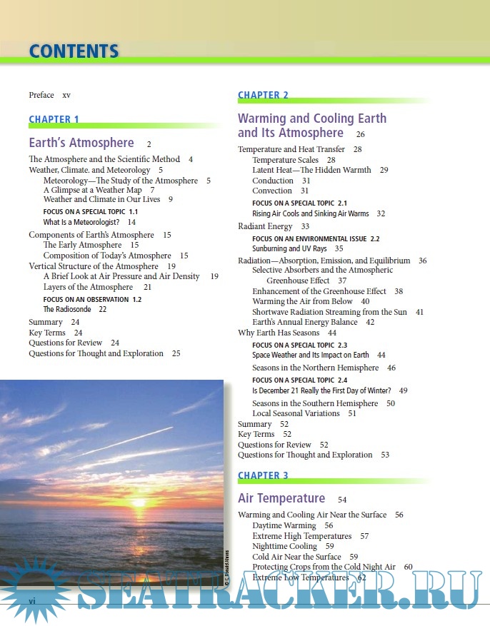 Year: 2018 Language: english Author: C. Donald Ahrens, Robert Henson Genre: Manual Publisher: Cengage Learning Edition: 8th Edition ISBN: 978-1-305-62845-8 Format: PDF Quality: eBook Pages count: 537 Description: Essentials of Meteorology is written for students taking an introductory course on the atmospheric environment, and for meteorology instructors who need a reference manual to be fully exploited. The main purpose of the text is to convey meteorological concepts in a visual, practical, and non-mathematical manner. In addition, the intent of the book is to stimulate curiosity in the reader, and to answer questions about weather and climate that arise in our day-to-day lives. Although introductory in nature, this eighth edition maintains scientic integrity and includes up-to-date information on large-scale topics, such as global warming, ozone depletion etc. As in previous editions, no special prerequisites are necessary for understanding. The text encourages watching the weather so that it becomes “alive”, allowing readers to immediately apply textbook material to the world around them. To assist with this endeavor, a color Cloud Chart appears at the back of the text, that can be used used as a learning tool. To strengthen points and clarify concepts, illustrations are rendered in full color throughout. Several appendices, that were only available online, have been reincorporated. Organized into fifteen chapters, Essentials of Meteorology is designed to provide maximum fexibility to instructors of weather and climate courses. Thus, chapters can be covered in any desired order. For example, Chapter 15, “Light, Color, and Atmospheric Optics,” is self-contained and can be covered earlier if so desired. Focus sections fall into one of three distinct categories: Observations, Special Topics, and Environmental Issues. Some include material that is not always found in introductory meteorology textbooks—subjects such as space weather, the scientific method, and wind energy. Others help to bridge theory and practice. Set apart as “Did You Know?” features in each chapter is weather information that may not be commonly known.