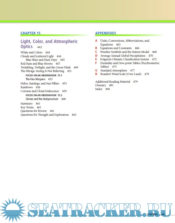 To strengthen points and clarify concepts, illustrations are rendered in full color throughout. Several appendices, that were only available online, have been reincorporated. Organized into fifteen chapters, Essentials of Meteorology is designed to provide maximum fexibility to instructors of weather and climate courses. Thus, chapters can be covered in any desired order. For example, Chapter 15, “Light, Color, and Atmospheric Optics,” is self-contained and can be covered earlier if so desired.