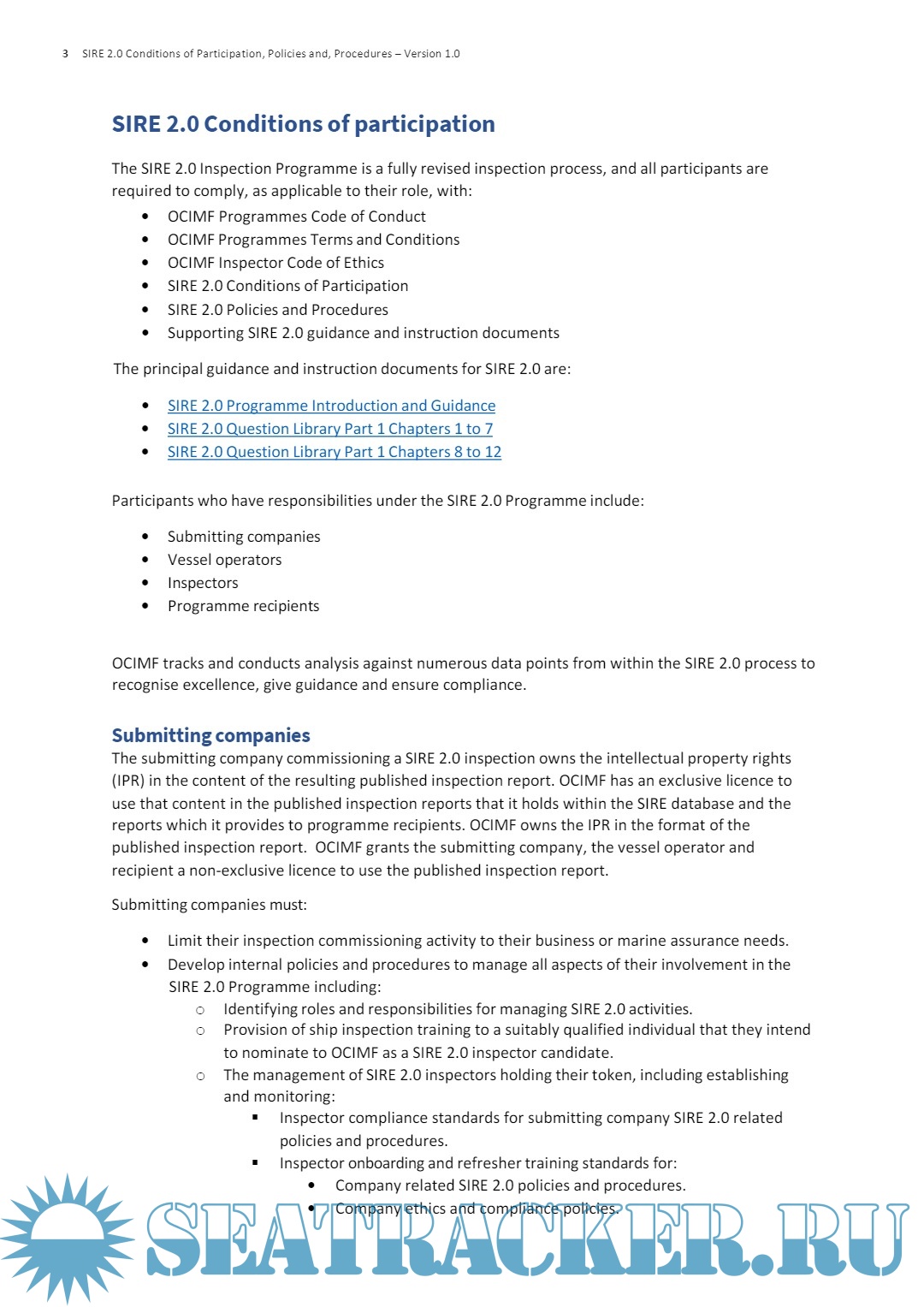Description: Guide on participants responsible for the SIRE 2.0 Programme include submitting companies, vessel operators, inspectors, and programme recipients.