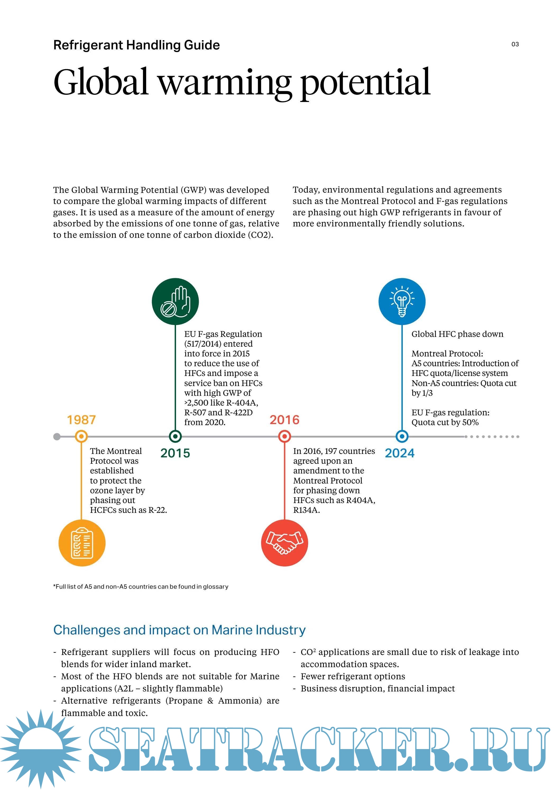 Year: 2023 Language: English Author: Wilhelmsen Genre: Guide Format: PDF Quality: eBook Pages count: 22 Description: Refrigerant Handling Guide produced by Wilhelmsen Ships Service (Unitor). The Global Warming Potential (GWP) was developed to compare the global warming impacts of different gases. It is used as a measure of the amount of energy absorbed by the emissions of one tonne of gas, relative to the emission of one tonne of carbon dioxide (CO2). Today, environmental regulations and agreements such as the Montreal Protocol and F-gas regulations are phasing out high GWP refrigerants in favour of more environmentally friendly solutions.