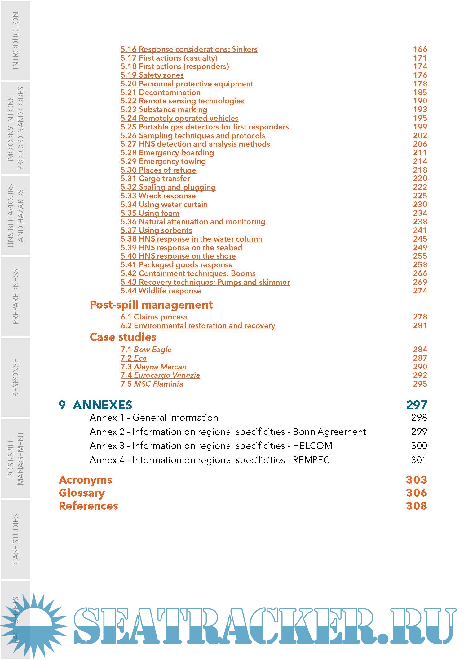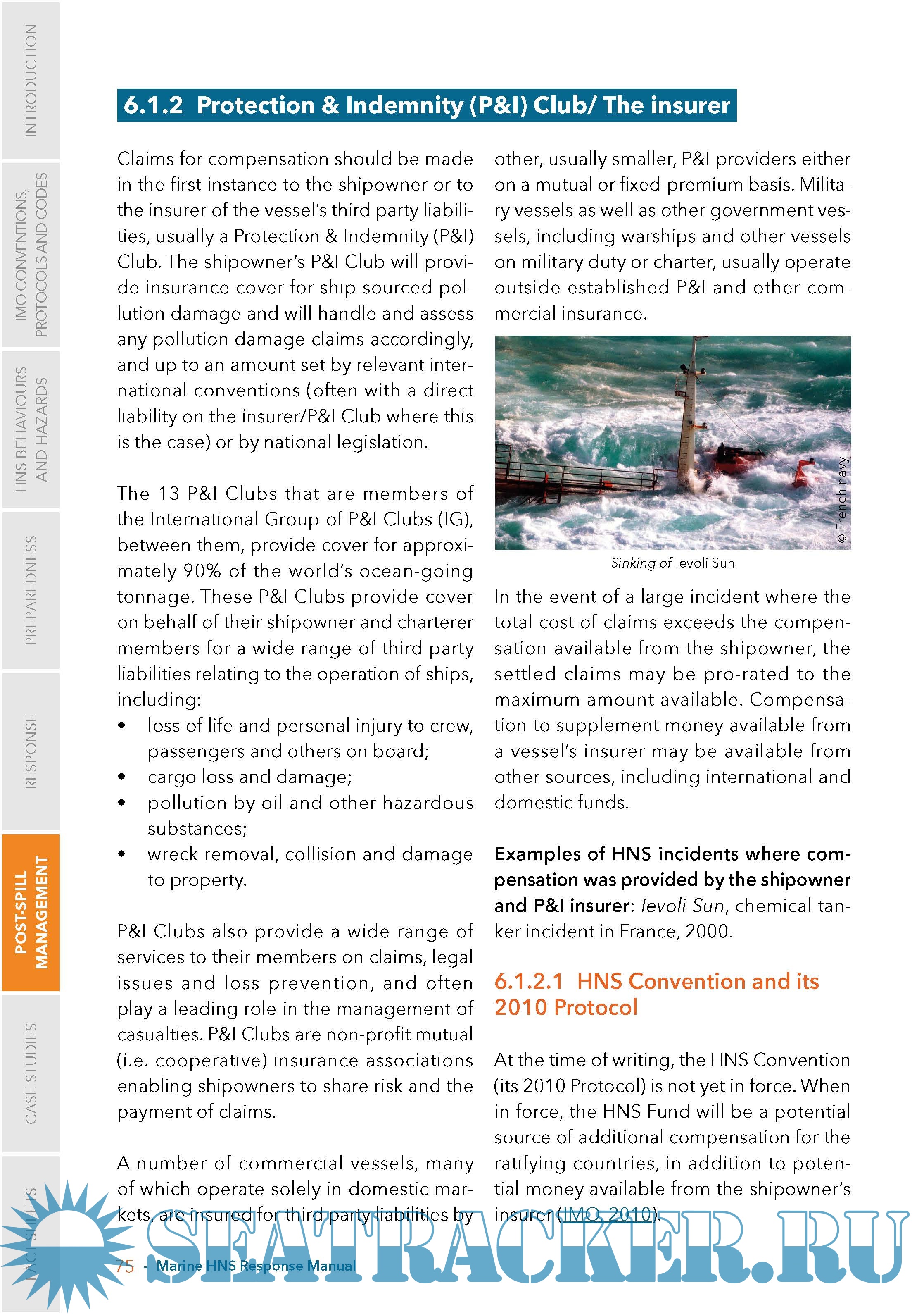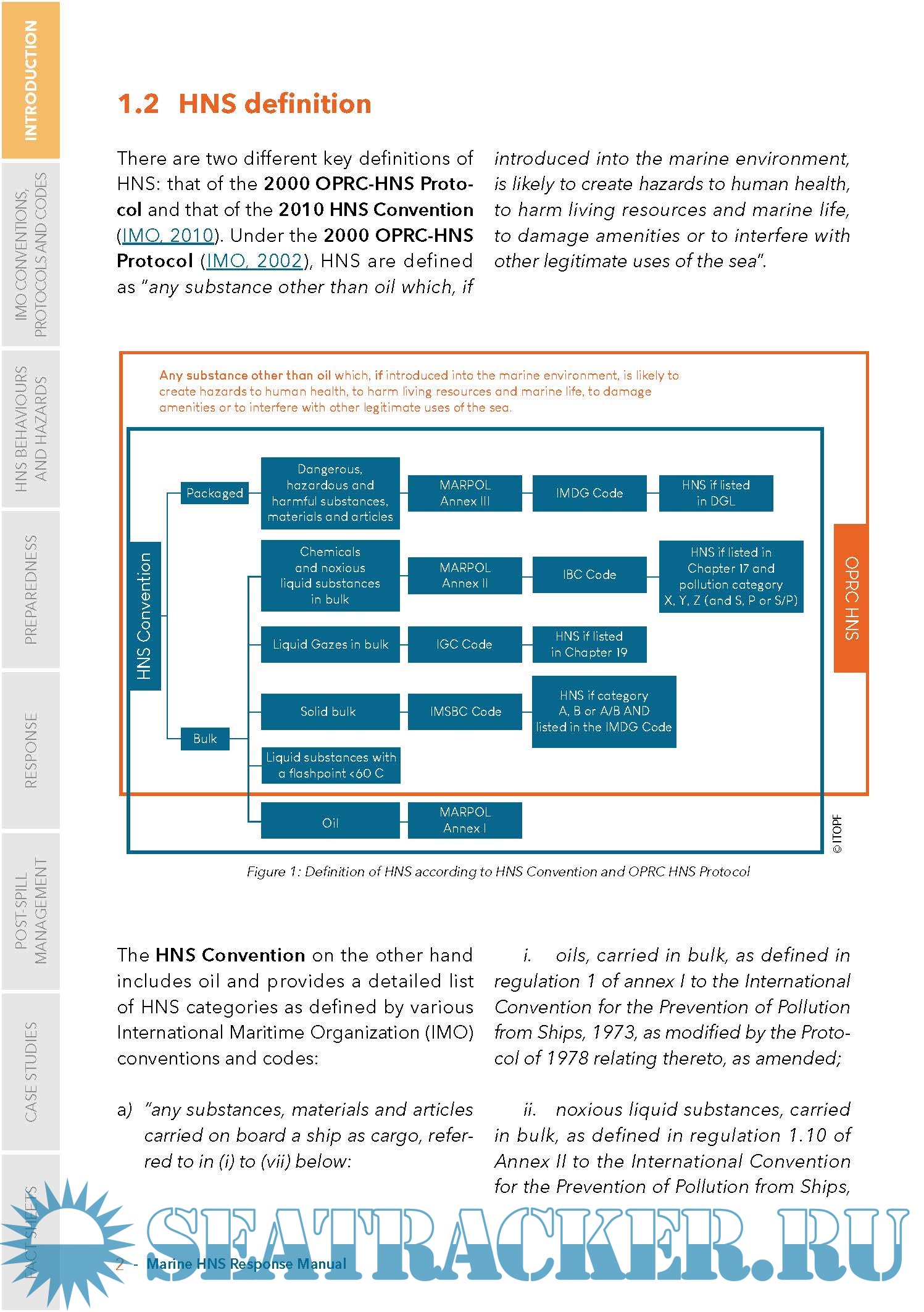 Year: 2024 Language: English Author: ITOPF Genre: Manual Edition: 17 January 2024 Format: PDF Quality: eBook Pages count: 335 Description: Responding to chemical spills is not as straightforward as spills of oil. Many unique scenarios can emerge during an HNS incident due to the variety of chemicals present, their hazards, how they behave in the environment, potential effects on human health and their varying physical and chemical properties. The present Manual has been developed by Cedre, ISPRA and ITOPF in the framework of the West MOPoCo project at the request of the Secretariat of the Bonn Agreement, HELCOM and REMPEC, to provide state of the art information on HNS pollution preparedness and response. The competent national authorities of Member States of the three regional conventions were consulted at each step of the drafting process, to ensure the Manual meets their operational needs and to enrich it with their national experience in responding to chemical spills at sea. The objective of this Marine HNS Response Manual is to provide operational guidance for first responders and decision-makers during a maritime incident at sea or in port involving HNS. The manual does not cover all aspects of an incident involving HNS, but specifically addresses relevant offshore and onshore spill response techniques (but excludes topics such as search and rescue, salvage, medical treatment).