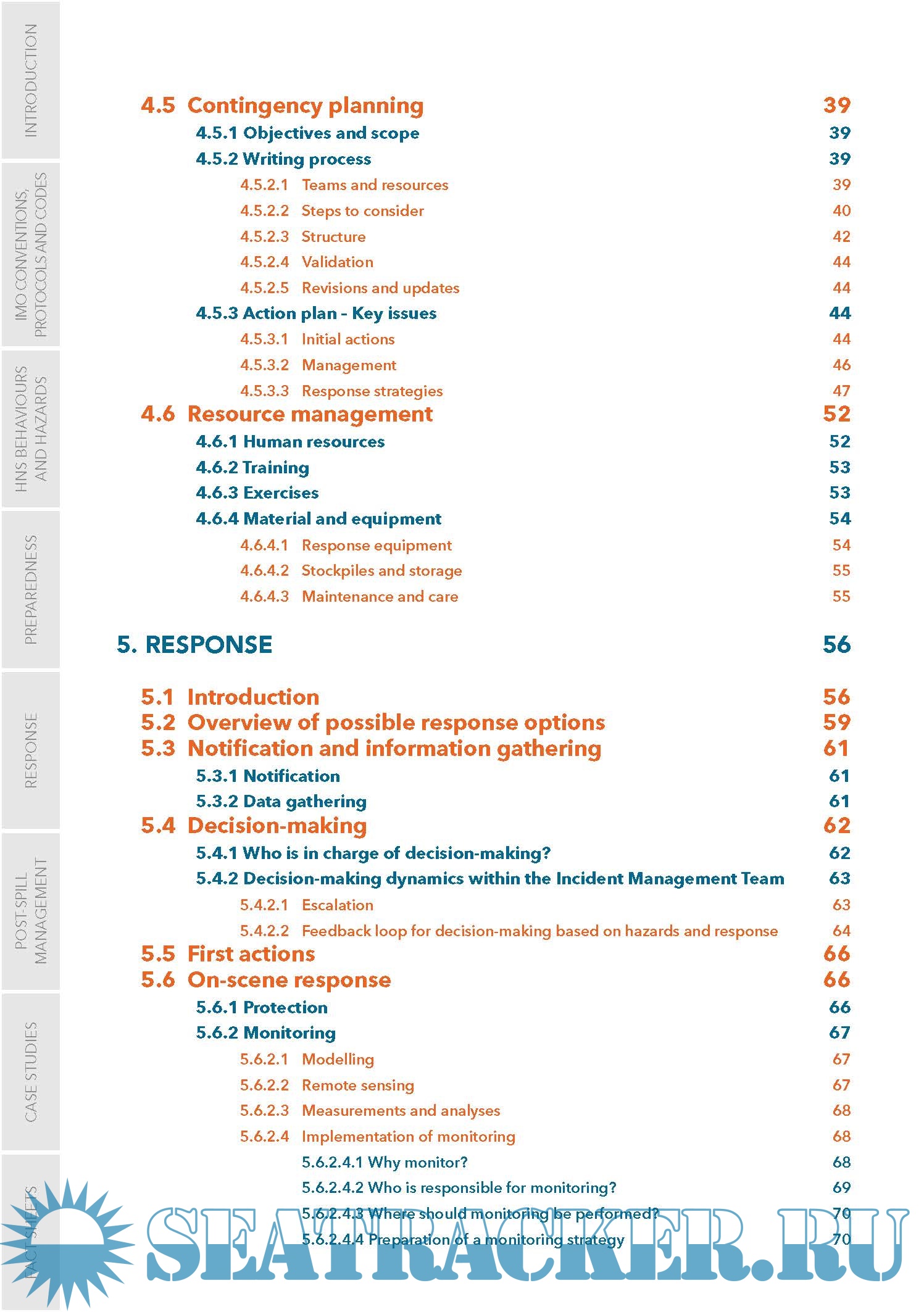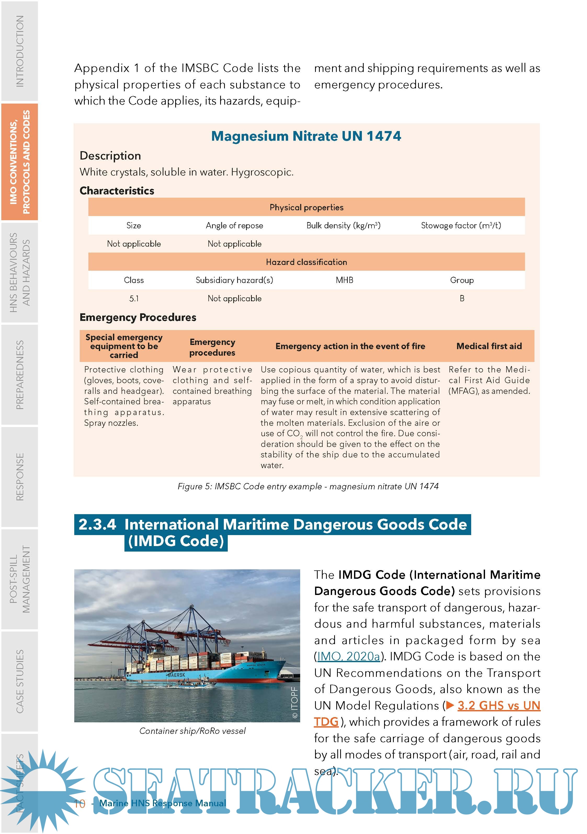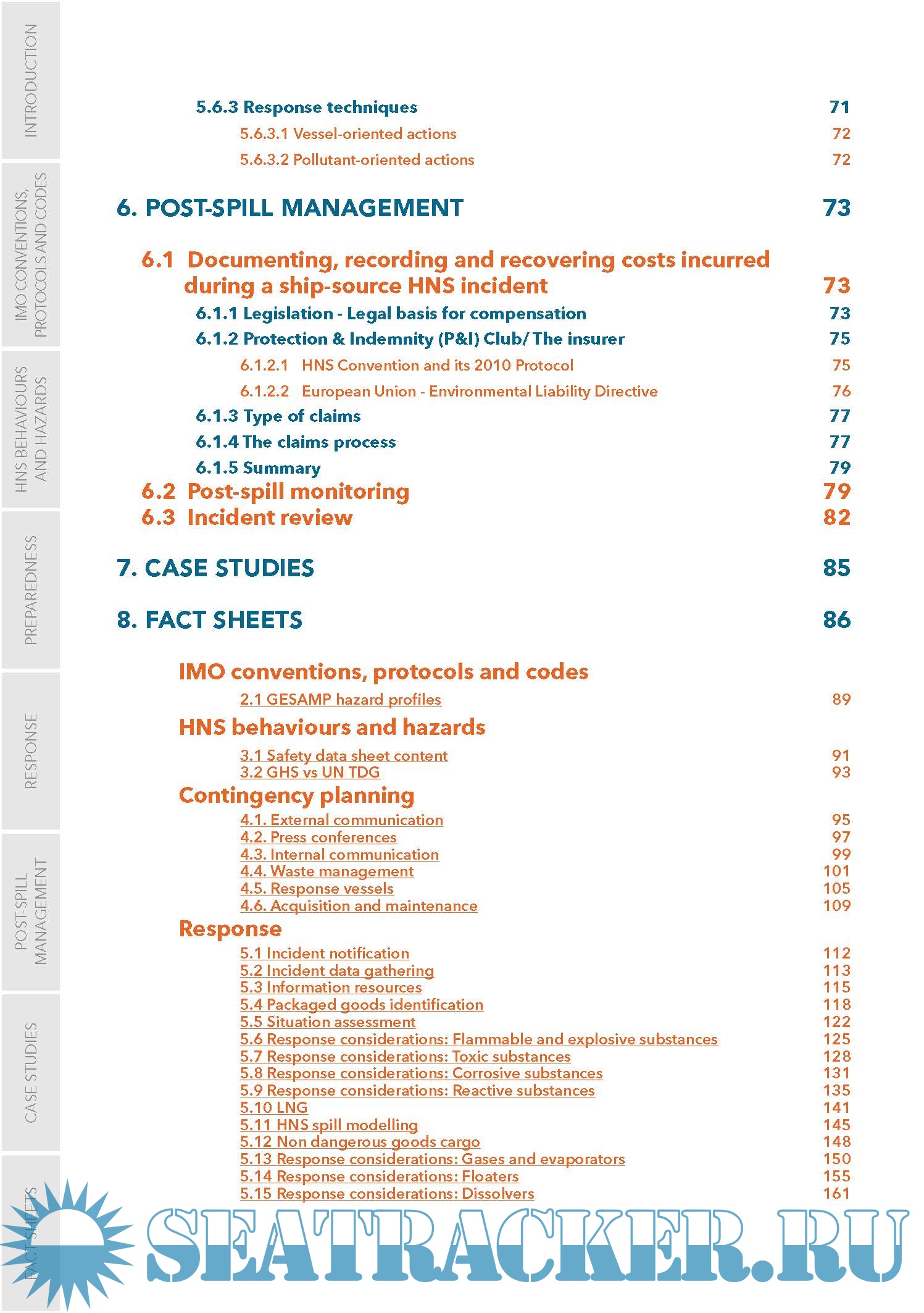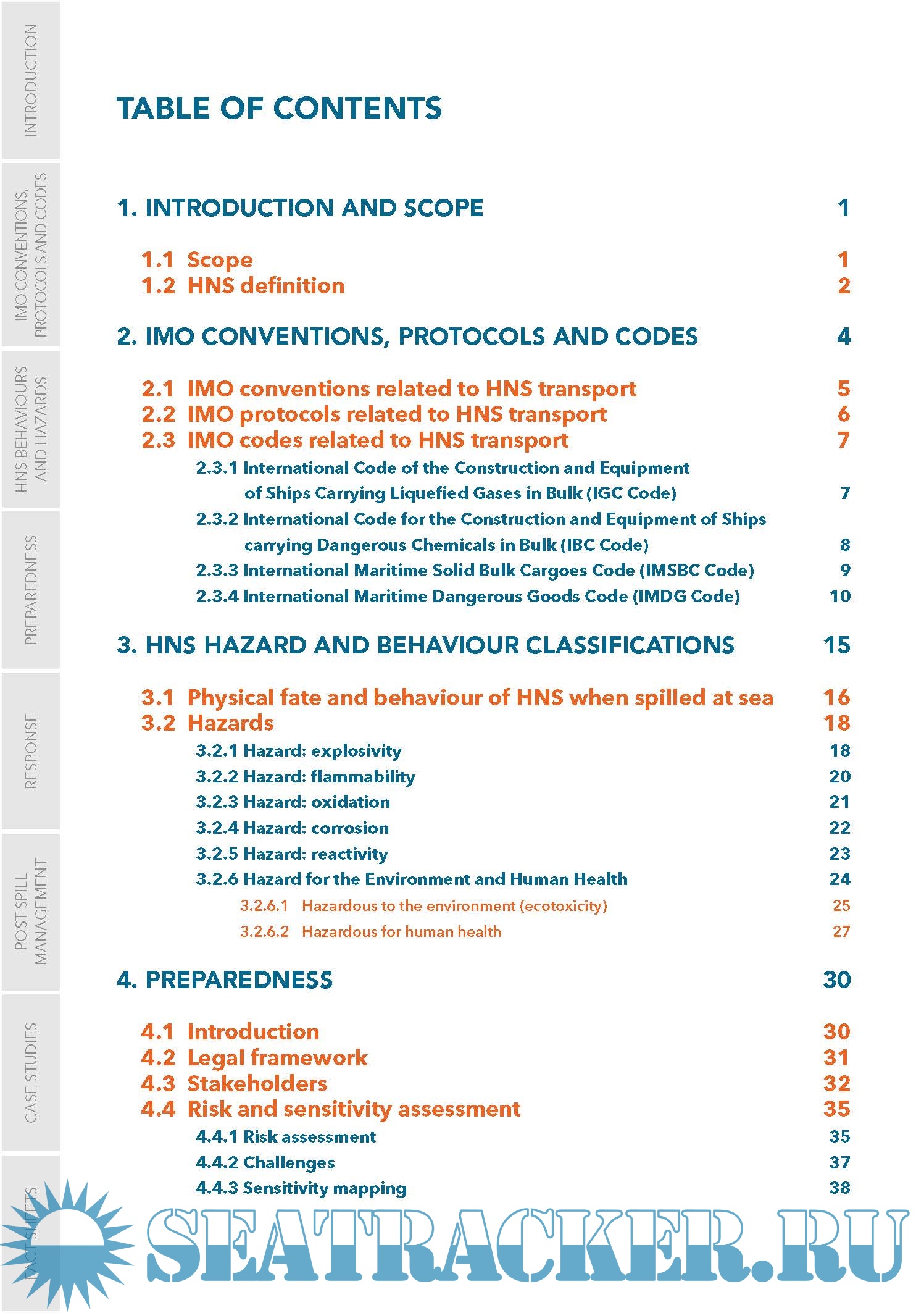 The objective of this Marine HNS Response Manual is to provide operational guidance for first responders and decision-makers during a maritime incident at sea or in port involving HNS. The manual does not cover all aspects of an incident involving HNS, but specifically addresses relevant offshore and onshore spill response techniques (but excludes topics such as search and rescue, salvage, medical treatment).