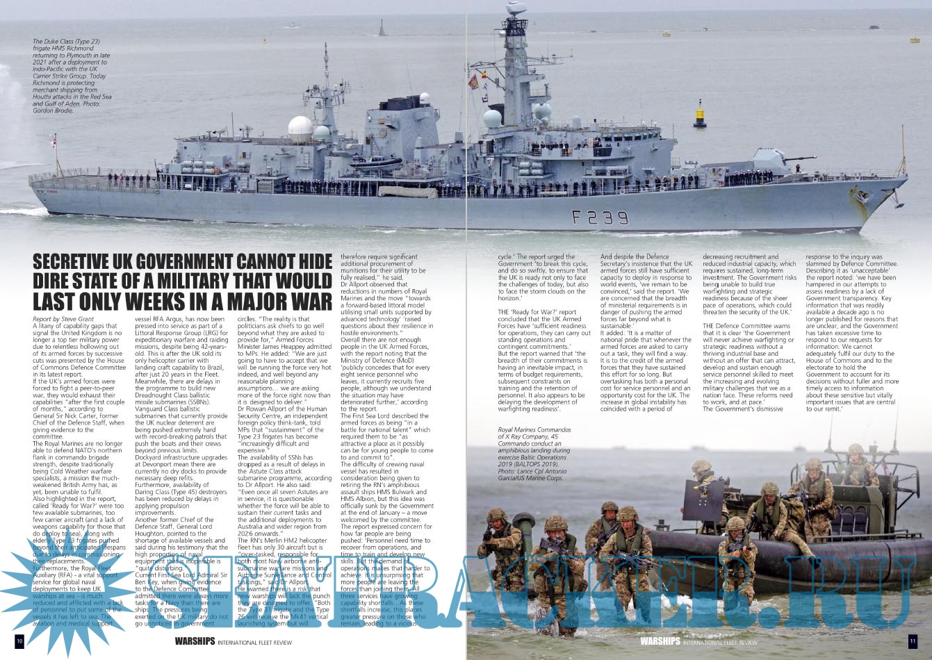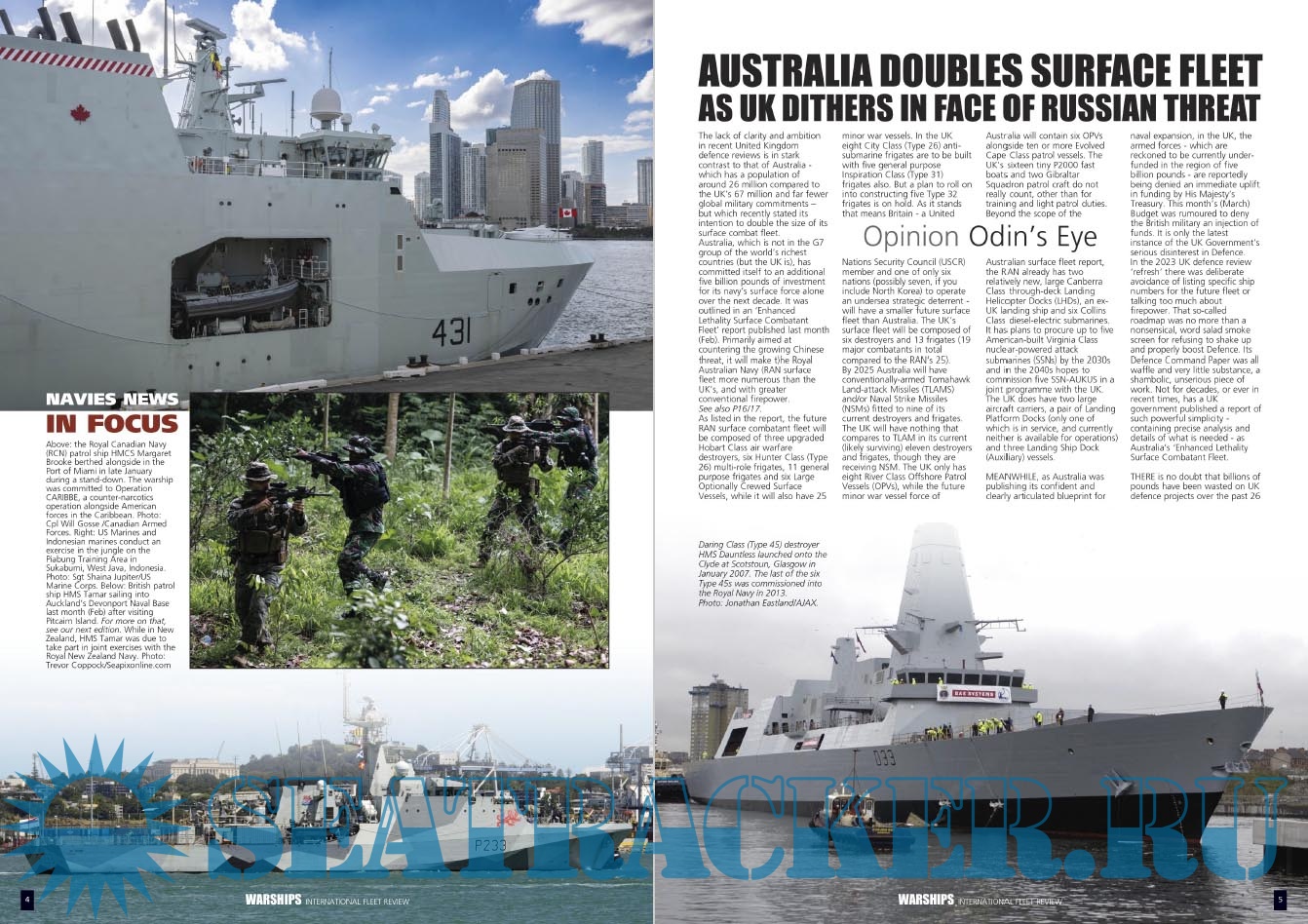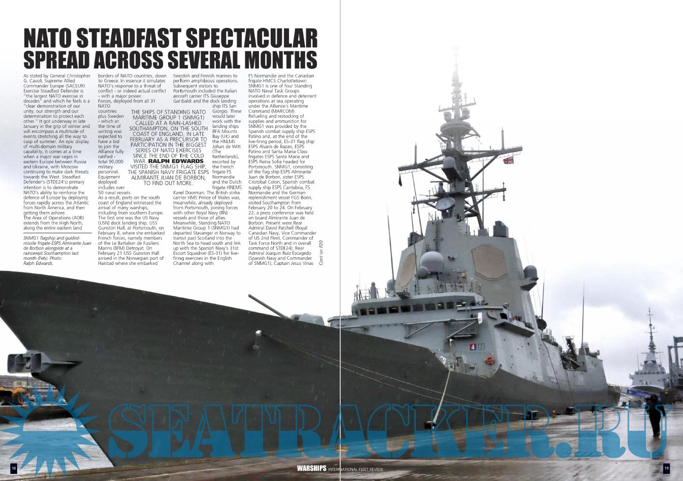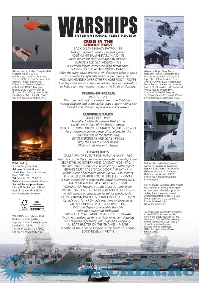 Year: 2024 Language: English Author: Warships International Fleet Review Magazine - Marsh Edition: 2024-4 Format: PDF Quality: eBook Pages count: 52 Description: Warships IFR puts the spotlight on the latest developments in the world’s navies. It covers current defence issues and has comments by leading analysts. The magazine regularly includes features on the Royal Navy and the US Navy in addition to incorporating news and features on all other navies across the globe. Warships IFR frequently carries in-depth articles on naval heritage.WARSHIPS International Fleet Review is published 12 times a year by Tandy Media Ltd who also publish Shipping Today & Yesterday (which provides news and features from the world of merchant shipping).