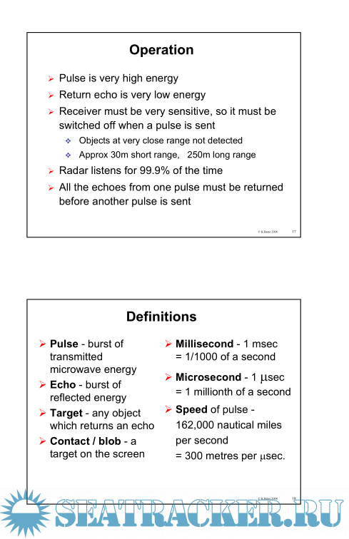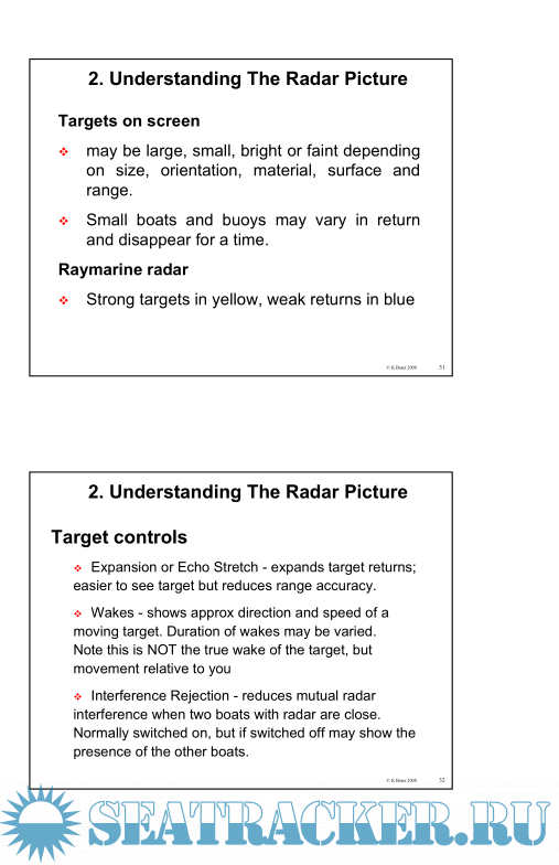 63 pages of presentations that can be read on their own, in front of a Radar screen or alongside the RYA Radar course book