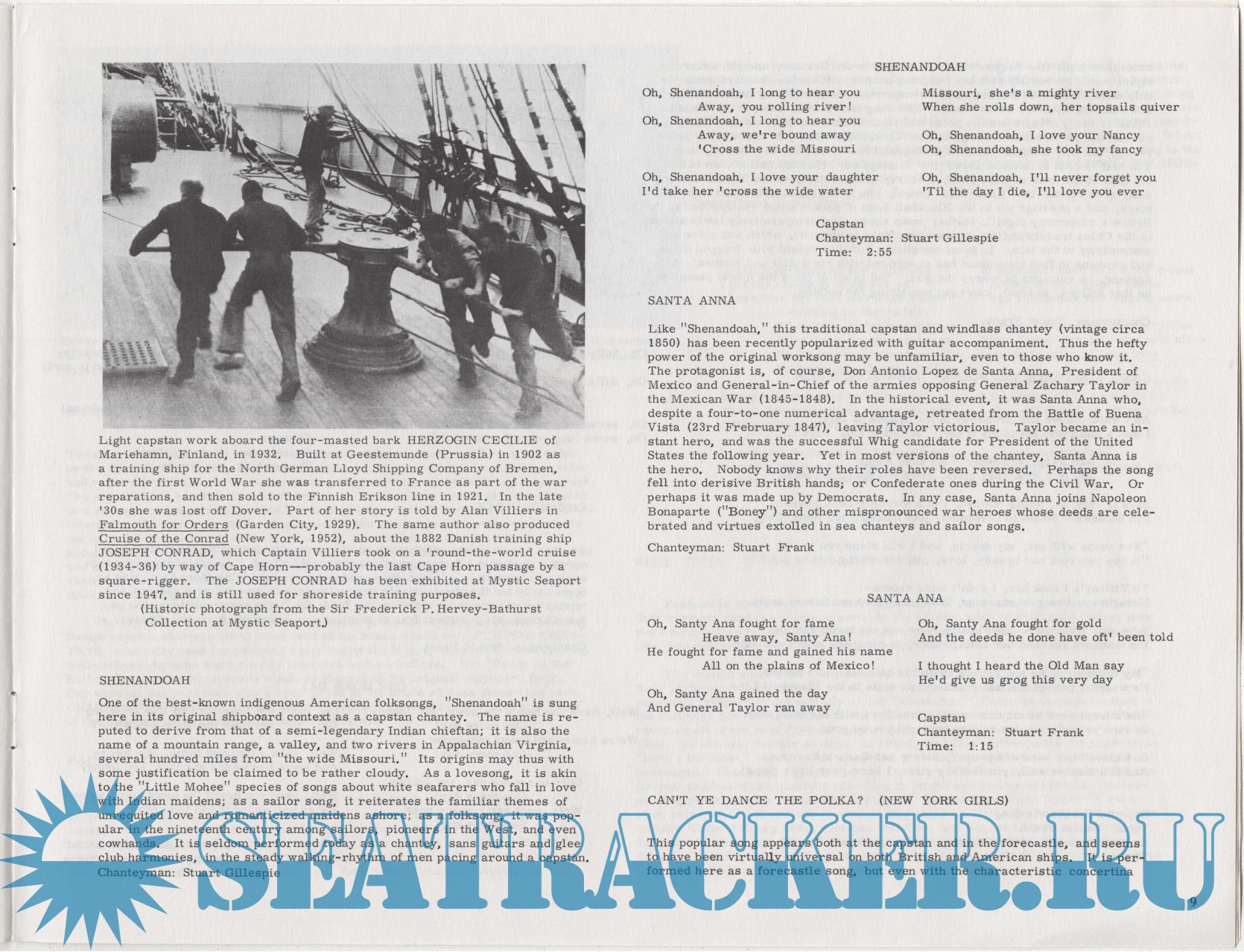 Year: 1978 Language: english Author: Frank S.M. at all. Genre: History Publisher: Folkways Records Format: PDF Quality: Photo of pages Pages count: 22 Description: This album features classic sea shanties from the 19th century, "sung in the traditional manner, accompanied on historic 19th-century instruments, and recorded aboard historic sailing ships" at the Mystic Seaport Maritime Museum. Shanties were sung to make the heavy labor aboard merchant sailing vessels more coordinated, efficient, and lighter. "To hear a good yarn, and sing out a lively, rowdy chorus, was far more pleasurable" than listening to the Bosun yelling orders. Liner notes include background on chanties, song lyrics, and black-and-white photographs of sailors. Additional info: Recorded aboard the historic ships Charles W. Morgan and Joseph Conrad.
