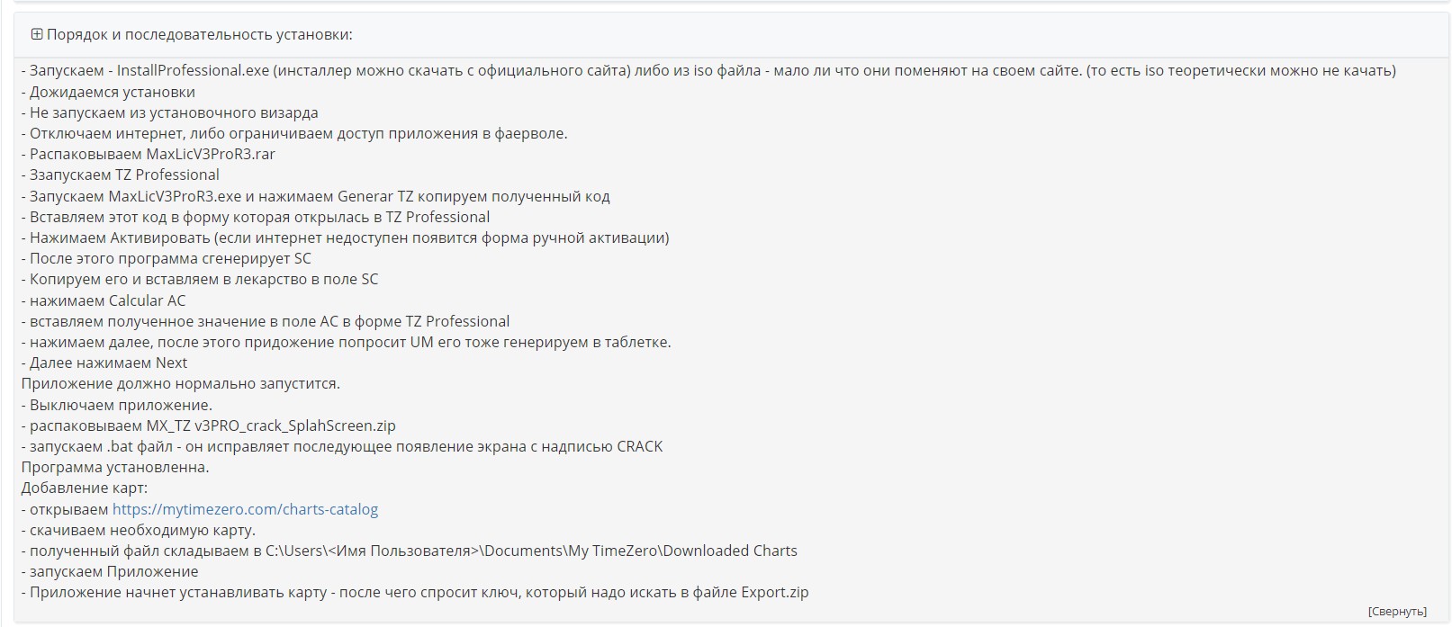 Инструкции по установке: 1. Отключите подключение к Интернету. 2. Запустите программу установки «InstallProfessional v4.2.0.132 (сборка 4.2.186.0) Professional». После завершения установки снимите флажок «Вы хотите запустить TimeZero» и закройте всплывающее окно. 3. Запустите «MX_TZ v4PRO_crack_SplahScreen» и нажмите «Продолжить». он автоматически закроется. 4. Запускайте «Block Host.cmd», чтобы избежать проблем с кодом единой системы обмена сообщениями каждый раз, когда вы запускаете TIMEZERO. 5. Запустите кейген