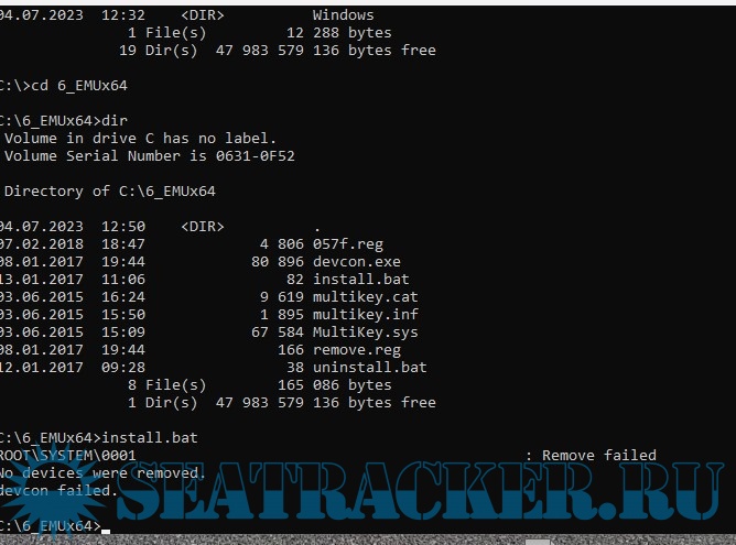 в терминале (cmd) напишите "cd C:\" (без кавычек) снова напишите "cd 6_EMUx64" напишите "install.bat", введите.