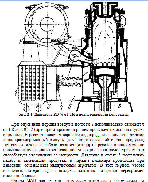 За истекшие 25-30 лет в конструкцию двухтактных двигателей Ом.ли внесены радикальные изменения. Фирмы-производители «Зульцер» и «МАН» отказались от контурных схем газообмена, и перешли на более перспективную прямоточную схему. Это позволило реализовать в новых моделях двигателей чисто газотурбинный наддув, Гимгодаря которому был достигнут высокого уровень форсировки рабочего процесса (Ре = 19 бар).