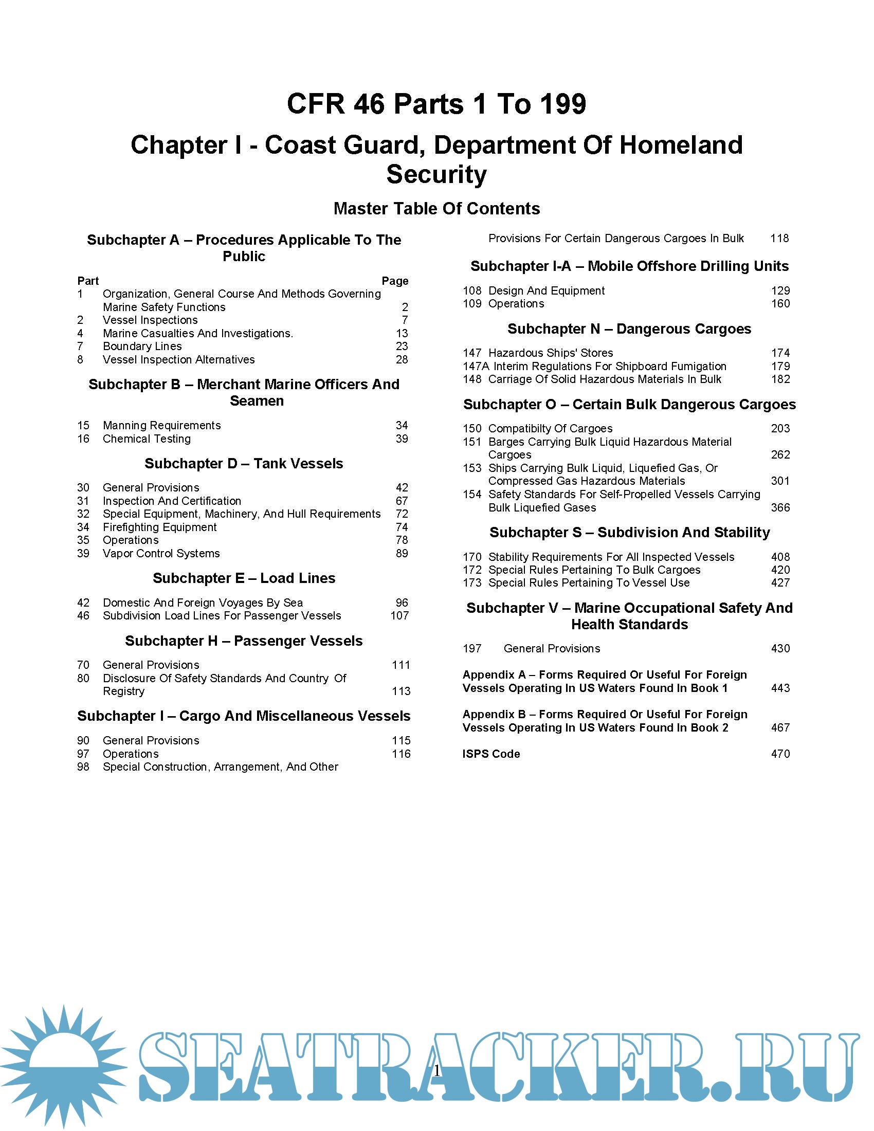 Year: 2015 Language: english Author: CG Publications Genre: Convention (rules) Format: PDF Quality: eBook Description: This book contains selected regulations enforced by the United States Coast Guard Title 46: Shipping of the Code of Federal Regulations (CFR) through July 1, 2015. These title are of primary concern to foreign and domestic shipping interests. The specific subchapters included are as follows: 46 CFR: Shipping Subchapter A: Procedures Applicable to the Public Subchapter B: Merchant Marine Officers and Seamen Subchapter D: Tank Vessels Subchapter E: Load Lines Subchapter H: Passenger Vessels Subchapter I: Cargo and Miscellaneous Vessels Subchapter I-A: Mobile Offshore Drilling Units Subchapter N: Dangerous Cargoes