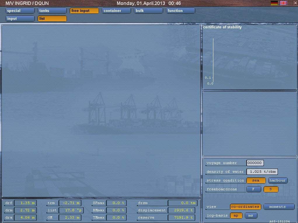 This software product is developed for planning cargo operations under consideration of draughts, trim, stability and stress. The cargo can consist of container, bulk, timber, break bulk and special goods (e.g. project cargo). The program is related to the individual ship to which one it is programmed for.