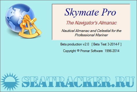 Year: 2012 Version: 3F Developer: Promar software Platform: Vista & Wndows7/8/10 32-bit and 64-bit Compatibility with Windows7: yes System Requirements: The Microsoft .NET Framework 3.5 must be installed on your system before you can run the latest version of Skymate Pro 2012 Localization: english Crack: Yeeah! Description: Skymate Pro 2012: The Navigator's Almanac is a computerized Nautical Almanac. Using an internal almanac for the years 1900-2100, Skymate Pro 2012 will provide Mariners the accurate information needed for celestial navigation at sea. To maximize the full potential of Skymate Pro 2012, the user should have a working knowledge and proficiency in the terminology and skills of celestial navigation. Additional info: Если у вас не установлена соответствующая версия .NET Framework, программа предложит ее скачать и установить. После установки программы и замены исполняемого файла, данная бэтка будет работать до конца 2047 года. Региональные параметры вышей Windows должны быть либо английскими, либо в русских региональных параметрах должен быть изменен разделитель целой и дробной части чисел с запятой на точку, также как это принято по умолчанию в английских региональных параметрах! Иначе программа может работать неправильно!