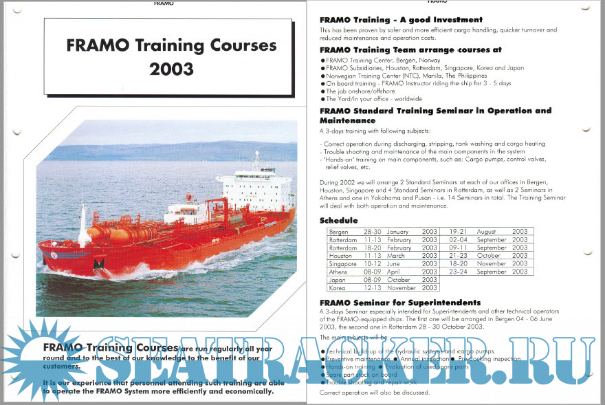 A 3-days Seminar especially intended for Superintendents and other technical operators of the FRAMO-equipped ships. The first one will be arranged in Bergen 04 - 06 June 2003, the second one in Rotterdam 28 - 30 October 2003.