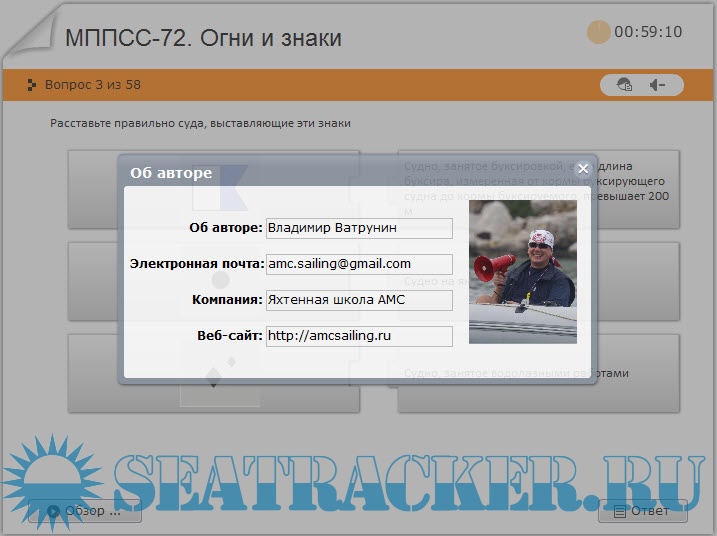 Год выпуска: 2013 Версия: 1.0 Разработчик: Центр яхтенной подготовки АМС Платформа: PC Совместимость с Windows7: да Язык интерфейса: русский Таблэтка: Не требуется Описание: Предлагаемый тест на знание огней и знаков судов не является всеобъемлющим, но и не является простым. Более того, в нем вообще отуствуют вопросы о парусных судах и обычных судах с механическим двигателем. Следует вспомнить, что не все суда включают кормовой и бортовые огни, когда они на ходу, но не имеют хода относительно воды. Не все суда показывают якорные огни, когда стоят на якоре. Не для всех судов по огням можно определить длину судна. Перед прохождением теста стоит еще раз прочитать соответствующий раздел Правил предупреждения столкновений судов в море. Если у вас не все получилось с первого раза, нажмите кнопку "Обзор" на странице теста с результатами. Все вопросы снабжены комментариями как к правильным, так и к неправильным ответам. Удачи!