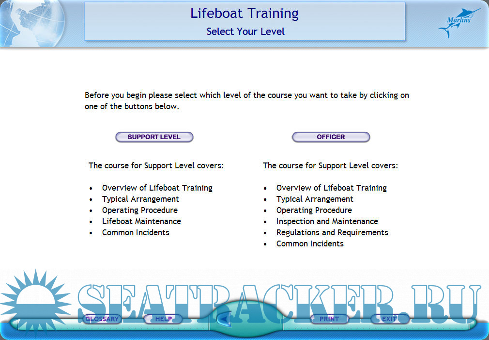 Description: The overall declared objectives of this computer-based training course developed by Marlins are to provide necessary instruction, training and explanation about all aspects of lifeboat operation, maintenance and certification, to describe the construction and working principles of the major components of the typical lifeboat systems, to highlight the regulations and the requirements, to provide explanations of abandon ship drill and procedures, provide a means to reinforce familiarization of equipment on board the ship, to test senior officers and crew on their understanding of lifeboat arrangement, operations and inspection/maintenance. The course for Support level covers overview of lifeboat training, typical arrangement, operating procedure, lifeboat inspection and maintenance, relevant regulations and requirements, and common incidents. After study of the first section of this training course, you shall be able to understand the whole importance of having lifeboat training, identify where lifeboat training can be carried out, specify the intervals for having lifeboat training, list the knowledge and skills you can obtain from lifeboat training, and describe how this computer-based training can enhance lifeboat training. The exercisel are presented in the form of a questionnaire.