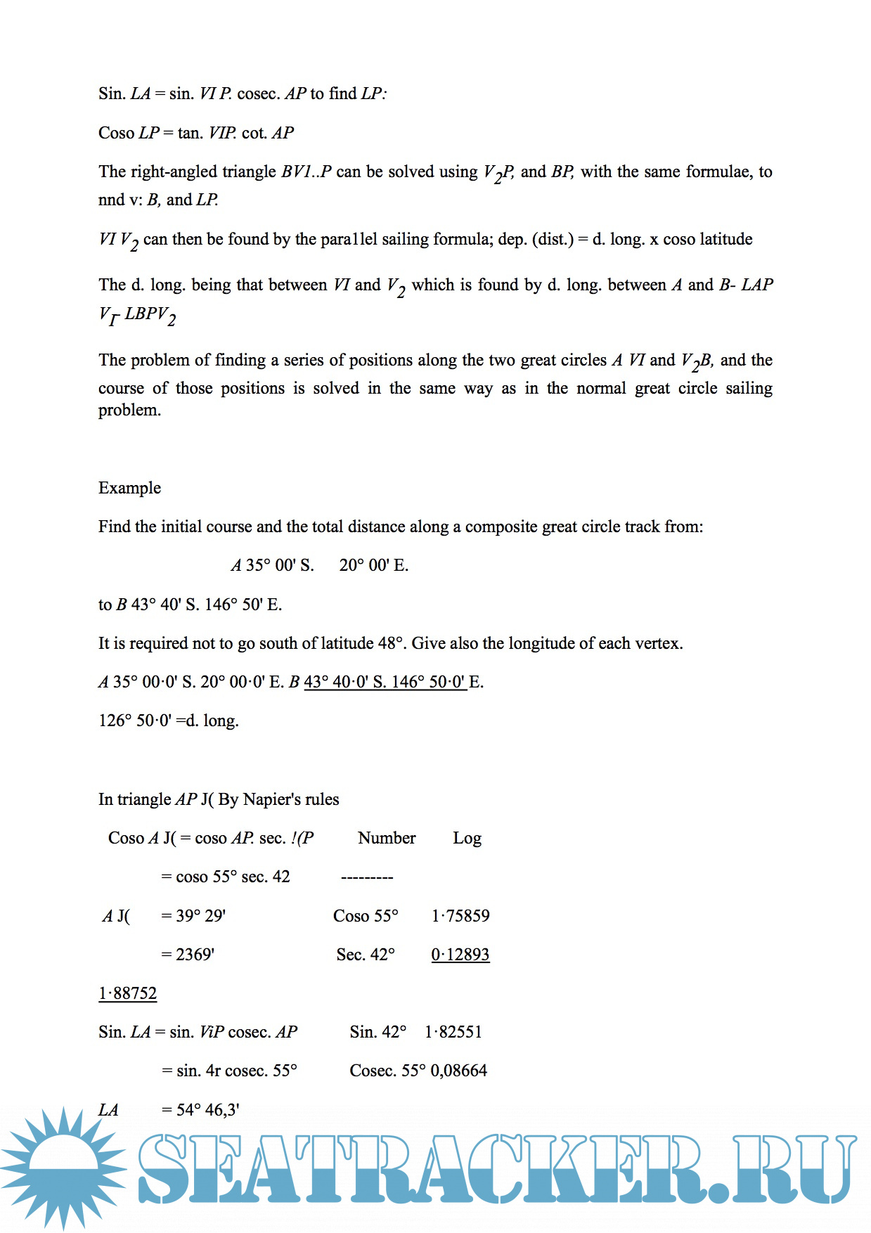 Calculation of courses and distance by great circle sailing. Calculation of courses and distance by composite great circle sailing.