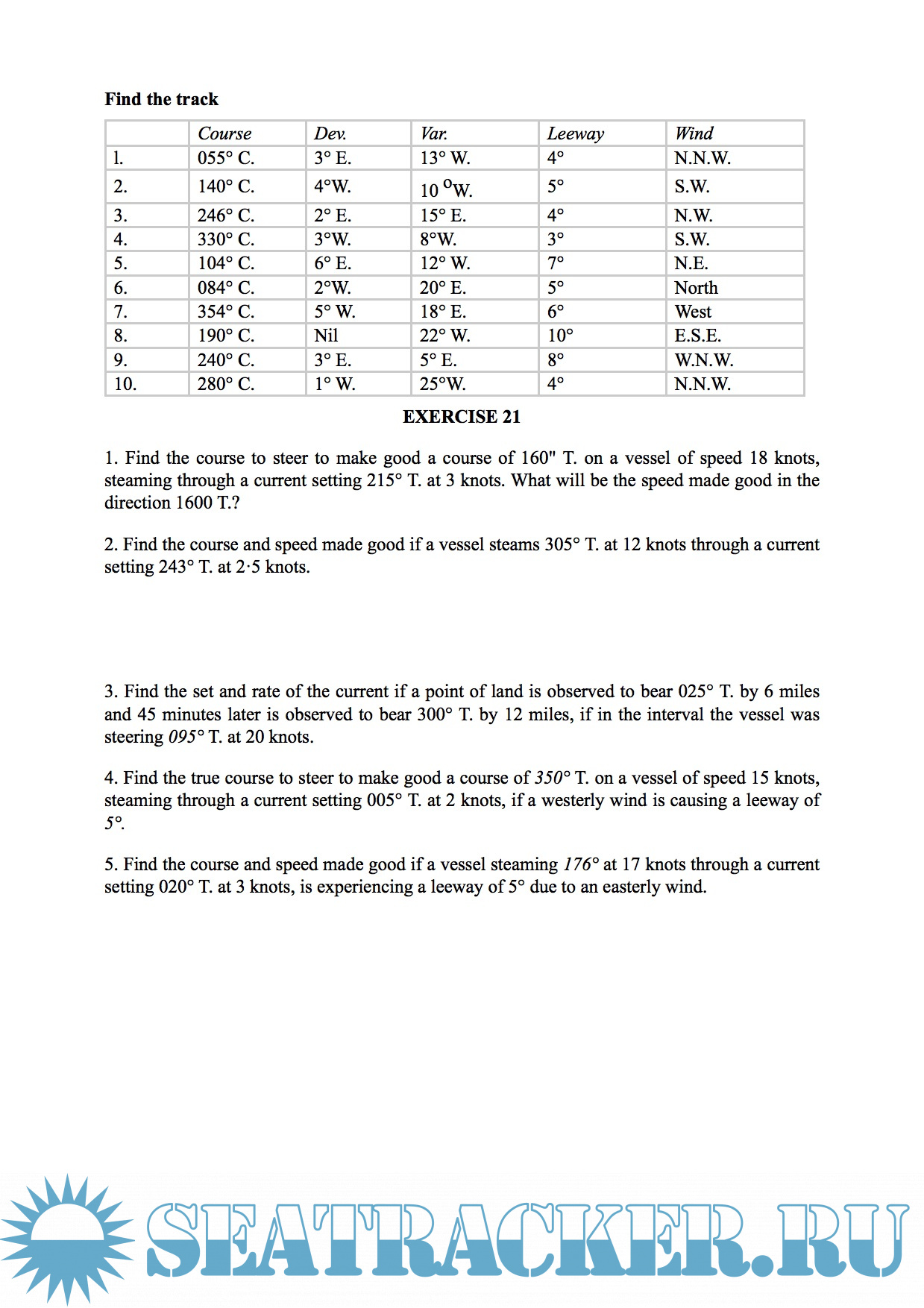 The three figure notation. The gyro compass. The magnetic compass. Variation and deviation. Compass error. The three norths. Relative bearing. The deviation table and its use. The effect of tide. Course made good. Counteracting the tide. To reach a position in a required time while counteracting a tide. To find the set and drift between two observed positions.