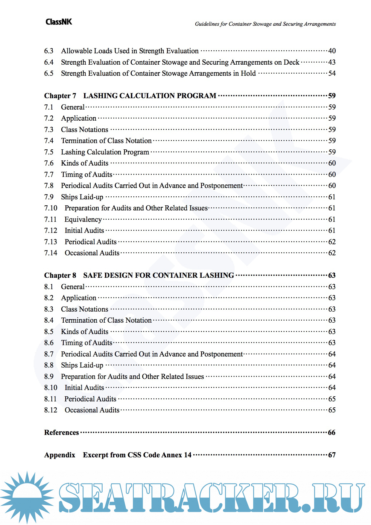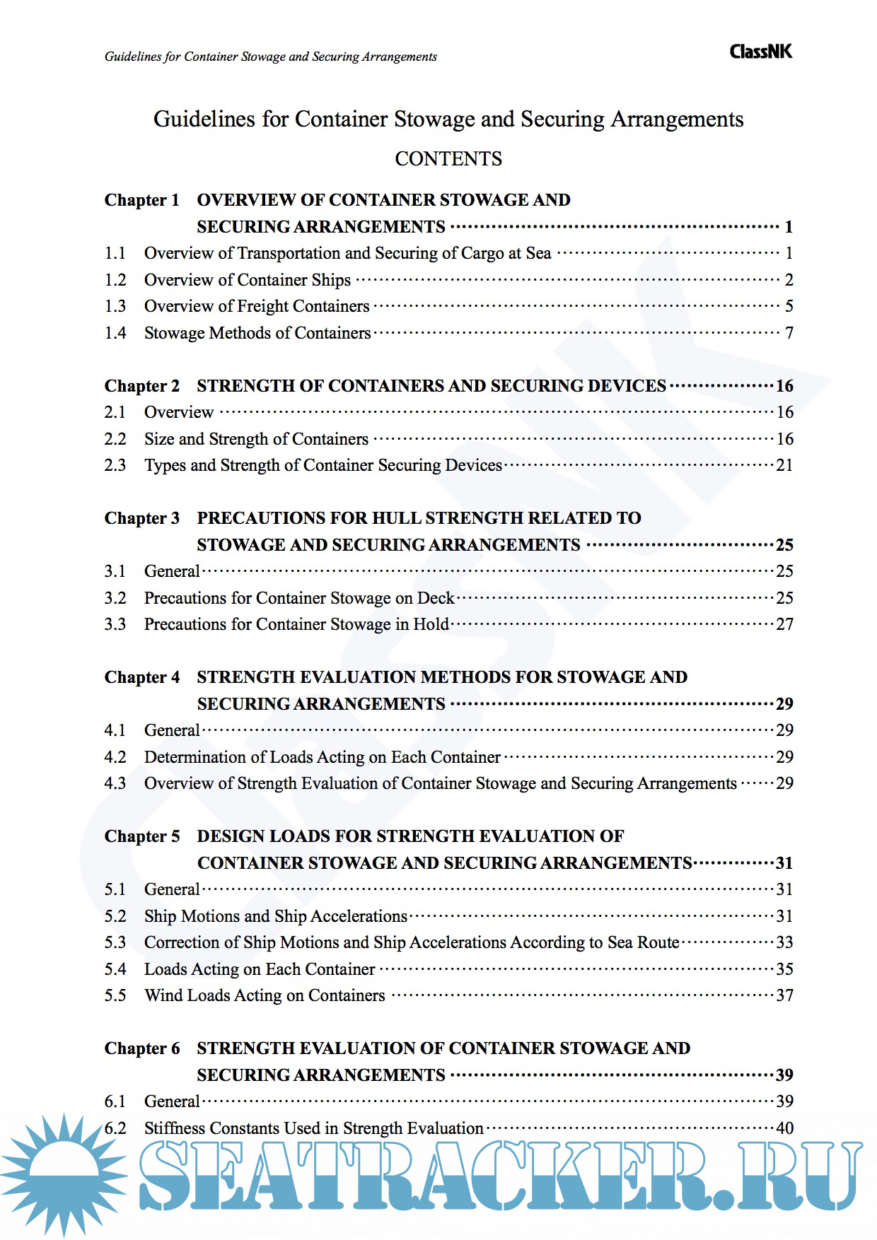 Year: 2014 Language: english Author: ClassNK Genre: Guide Publisher: ClassNK Edition: 2nd Edition December 2014 Format: PDF Quality: eBook Pages count: 88 Description: The main aim of merchant ships is to transport various goods by sea to their destinations safely without any loss or damage in route. For this purpose, it is essential to take adequate countermeasures to prevent cargo shifting and overloading in addition to ensuring proper ship operation. Recently, the amount of freight containers has significantly increased and container carriers have been getting larger for more effective transportation. Furthermore, various new technologies regarding securing arrangements, methods and devices have been developed to enhance the efficiency of loading containers on board. Accordingly, it has become more important to evaluate the adequacy of such container stowage and securing arrangements. ClassNK conducted extensive research and investigations on the practices and standards regarding container stowage and securing methods, and has published “Guidelines for Container Stowage and Securing Arrangements” in October 2009. In the guidelines, the latest ISO standards relating to containers are reflected and diversified container stowage and securing methods as well as detailed evaluation methods are shown and explained. In the second edition of the guidelines, the evaluation methods have been amended in order to enable the effect of sea routes, which the container ships operate in, to be taken into consideration. Also, procedures related to affixing class notations for the following two types of ships have been added