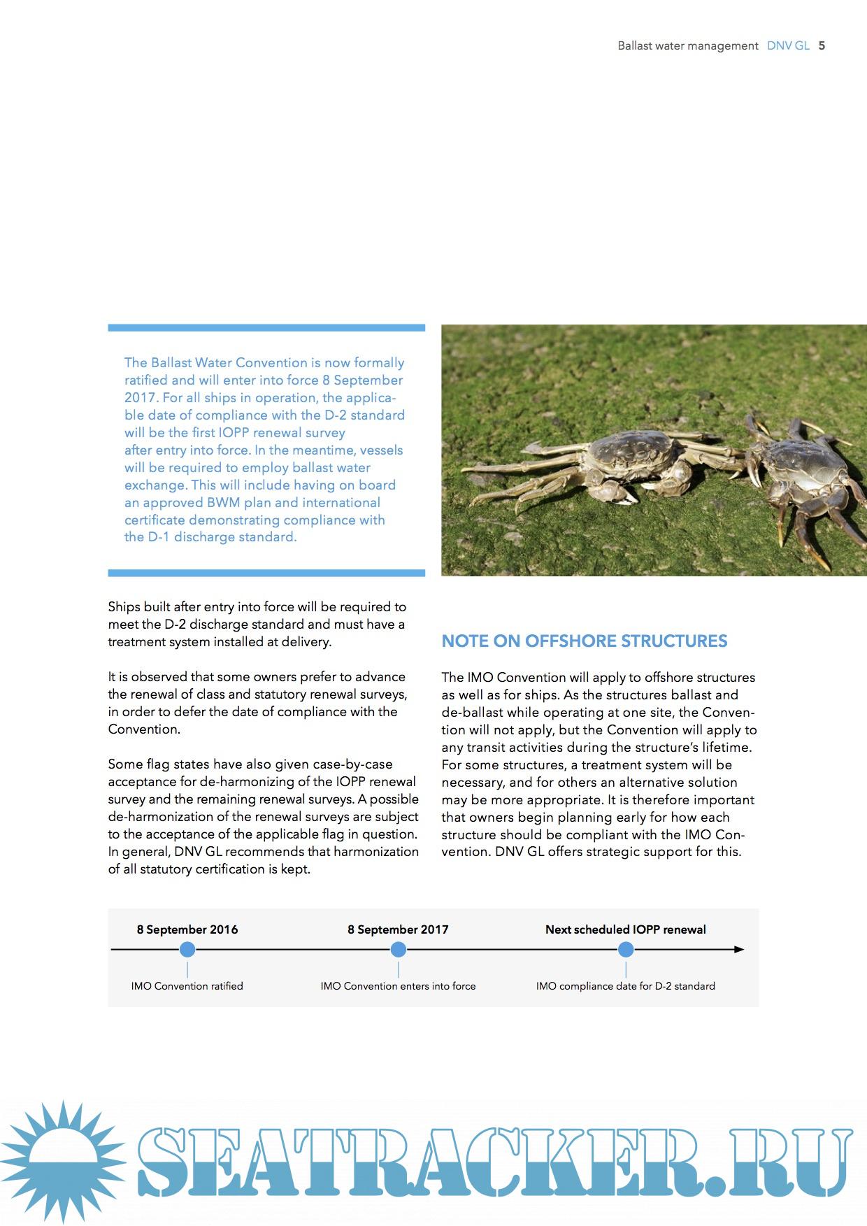 Year: 2017 Language: english Author: DNVGL Publisher: DNVGL Format: PDF / WORD Quality: eBook Pages count: 20 Description: Insights into the regulatory status, applicable treatment technologies and compliance solution The BWM Convention was rati ed by a suf cient number of states on 8 September 2016, bringing the total gross tonnage to over 35% from the signatory states. This means the convention will enter into force 12 months later, on 8 September 2017. This implies that most vessels, which do not already have a ballast water treatment system installed, will be requested to install such equipment in the period 2017–2021 – in each case before the expiry date of the vessel’s IOPP certi cate. Release including DNVGL booklet and 2 working BWMP templates