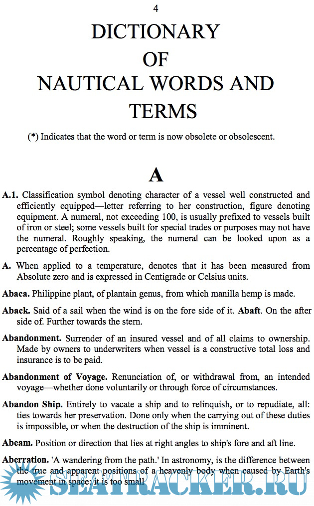 This book has been compiled to embody, in one volume, the words & terms that are, or have been, used by seamen in connection with their work. It deals with navigation, seamanship, rigging, meteorology, astronomy, naval architecture, ship economics, hydrography, cargo stowage, marine engineering, ice terminology, buoyage & other nautical matters. There are over 8,000 definitions covering many centuries of navigation & seamanship. Every endeavor has been made to extend the scope of the book through as wide a range of nautical subjects as would be helpful & interesting to the professional mariner & to the inquiring layman.