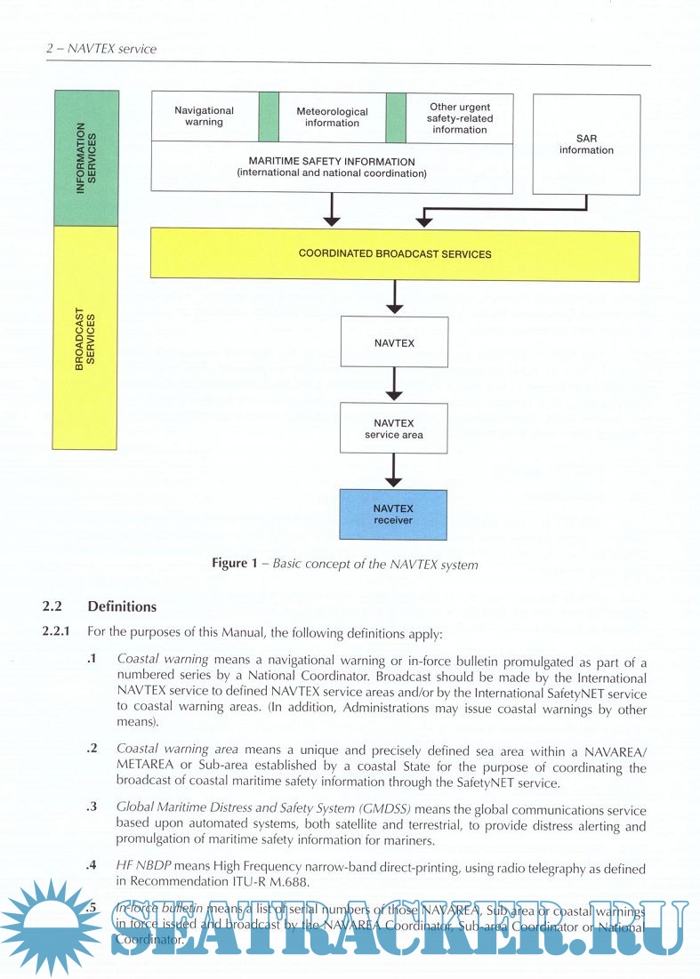Description: NAVTEX is an international automated direct-printing service for promulgation of navigational and meteorological warnings and other urgent information to ships. It is one of the two principle methods used for broadcasting maritime safety information in accordance with the provisions of the International Convention for the Safety of Life at Sea, 1974, as amended. It has been developed to provide a low-cost, simple and automated means of receiving maritime safety information and Search and Rescue alerts on board ships at sea and in coastal waters. The information transmitted may be relevant to all sizes and types of vessel and the selective message-rejection feature ensures that every mariner can receive safety information broadcasts which are relevant to their voyage.