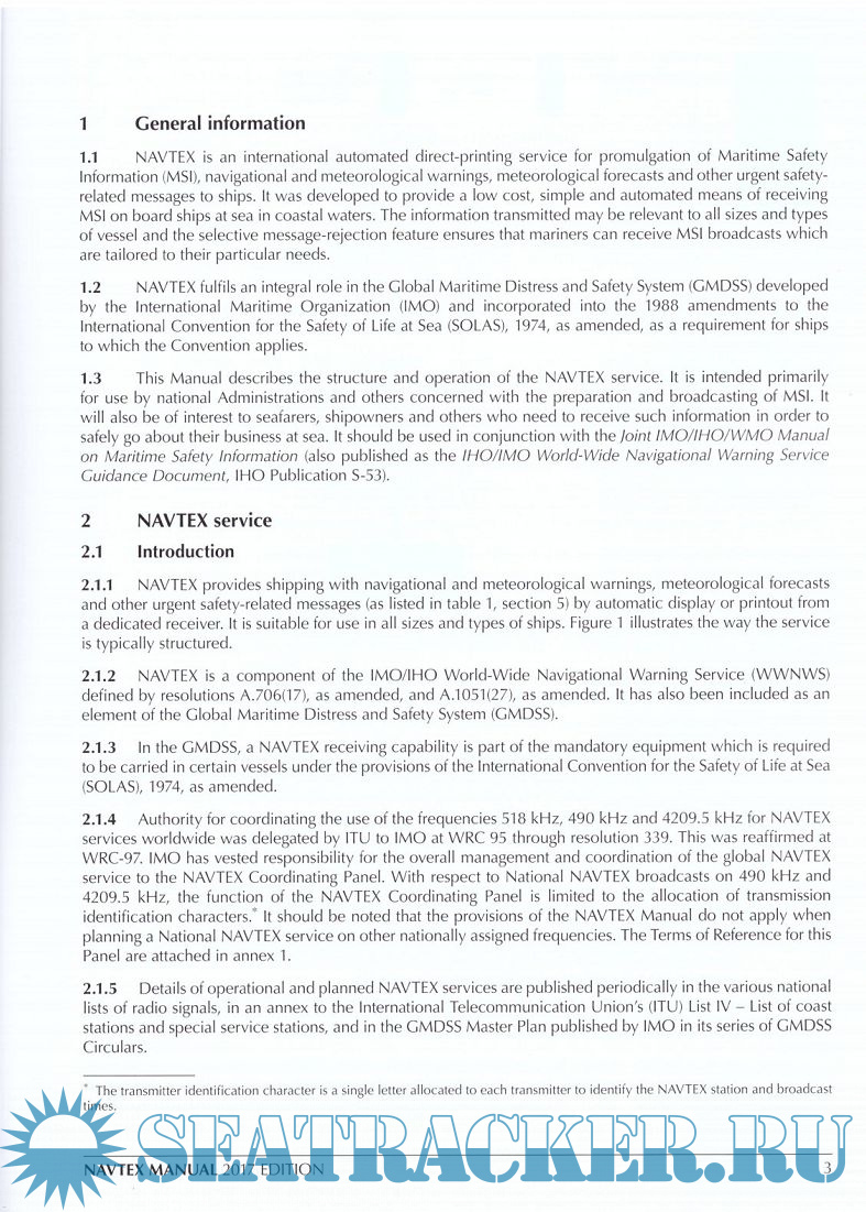 Year: 2017 Language: english Author: IMO Genre: Manual Publisher: CPI Group Edition: 6 ISBN: 978-92-801-1662-5 Format: PDF Quality: Scanned pages Pages count: 46 Description: NAVTEX is an international automated direct-printing service for promulgation of navigational and meteorological warnings and other urgent information to ships. It is one of the two principle methods used for broadcasting maritime safety information in accordance with the provisions of the International Convention for the Safety of Life at Sea, 1974, as amended. It has been developed to provide a low-cost, simple and automated means of receiving maritime safety information and Search and Rescue alerts on board ships at sea and in coastal waters. The information transmitted may be relevant to all sizes and types of vessel and the selective message-rejection feature ensures that every mariner can receive safety information broadcasts which are relevant to their voyage. This manual is intended, primarily, for use by maritime Administrations and others concerned with the preparation and broadcasting of maritime safety information. It will also be of interest to seafarers, shipowners and others who need to receive such information in order to safely go about their business at sea. Additional info: Blank pages where not scanned and they are missing at this book therefor.