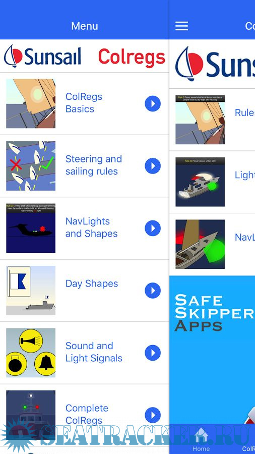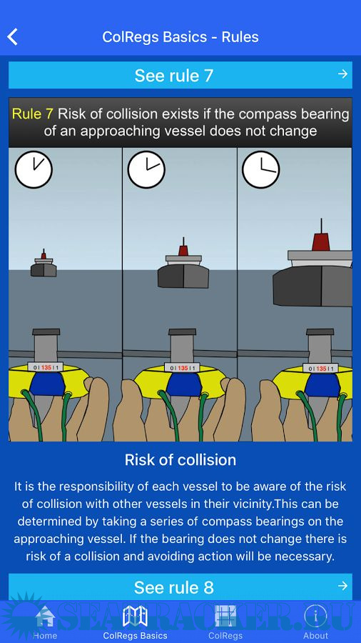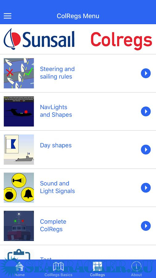 Year: 2017 Developer: theotherhat.biz Platform: Android System Requirements: Android 4.1 or higher Localization: english Crack: Not needed Description: A fully illustrated learning and revision tool for all sailing and power boaters, with 160 graphics explaining the ColRegs, The International Regulations for the Prevention of Collisions at Sea. SUNSAIL SAILING SCHOOL provides at-a-glance information to help all boaters learn how to identify other vessels and the activities they are engaged in, day or night. The app clarifies which vessels have priority, with explanatory graphics and captions, in addition to the complete rules. The app is divided into the following sections: COLREG BASICS - the key rules all sail and power boaters should learn. STEERING AND SAILING RULES - illustrated guide to the correct conduct of vessels in any visibility, in sight of one another and in restricted visibility. NAV LIGHTS AND SHAPES - illustrated guide to the navigation lights that should be used by the different types of vessel from sunset to sunrise and the day shapes that vessels should display during daylight. SOUND AND LIGHT SIGNALS - illustrated guide to the manoeuvring and warning signals, the sound signals to be used in restricted visibility and to distress signals. COMPLETE COLREGS - The International Regulations for Preventing Collisions at Sea (IRPCS) are reproduced in full. TEST YOURSELF - A series of multiple choice quizzes with graphic representations of the rules to help test your knowledge. ************ APP FEATURES and BENEFITS ******************* - Easy reference learning and revision tool for day skipper and similar courses worldwide. - 160 graphics and captions for clear, accurate explanations of the rules. - Researched and produced by nautical and marine experts for accuracy. - Positively evaluated by professionals for reliability. - Interactive online "Test Yourself" Section. - Rules & definitions available at the touch of a finger. - Expertly drawn illustrations accompanied by clear, concise descriptions of the rules. Additional info: Paid edition which costs 5.49 Euro at Google Market.