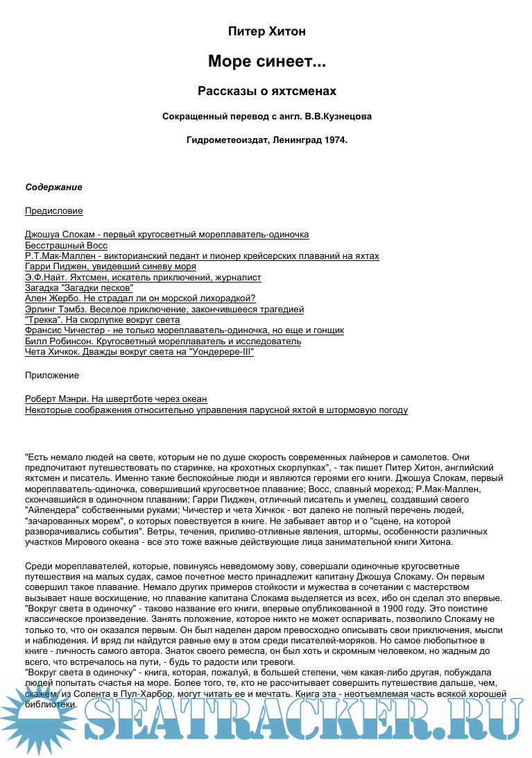 Описание: "Есть немало людей на свете, которым не по душе скорость современных лайнеров и самолетов. Они предпочитают путешествовать по старинке, на крохотных скорлупках", - так пишет Питер Хитон, английский яхтсмен и писатель. Именно такие беспокойные люди и являются героями его книги: