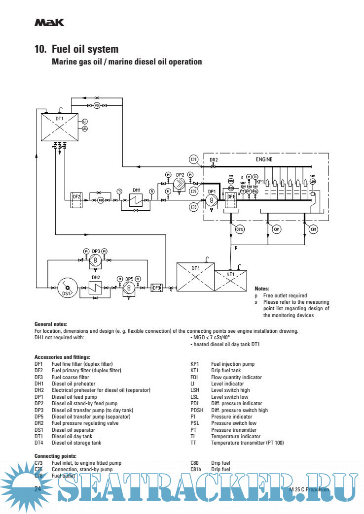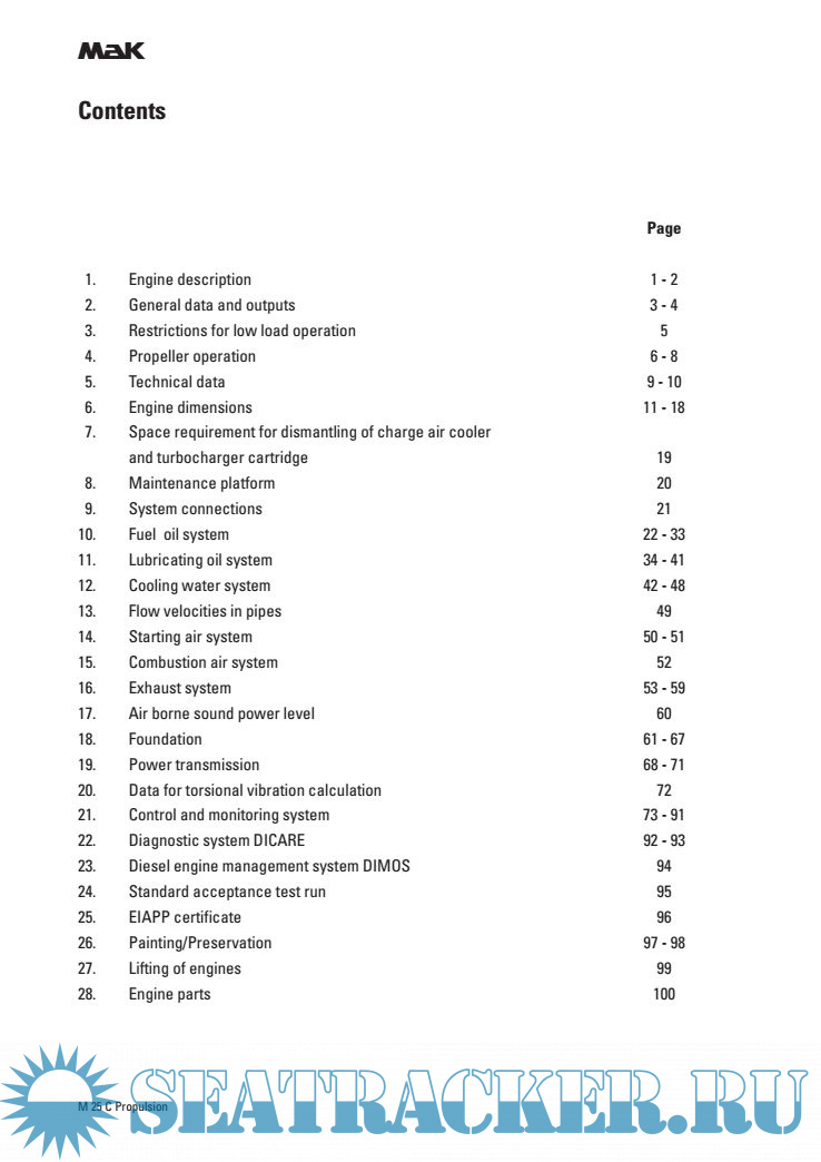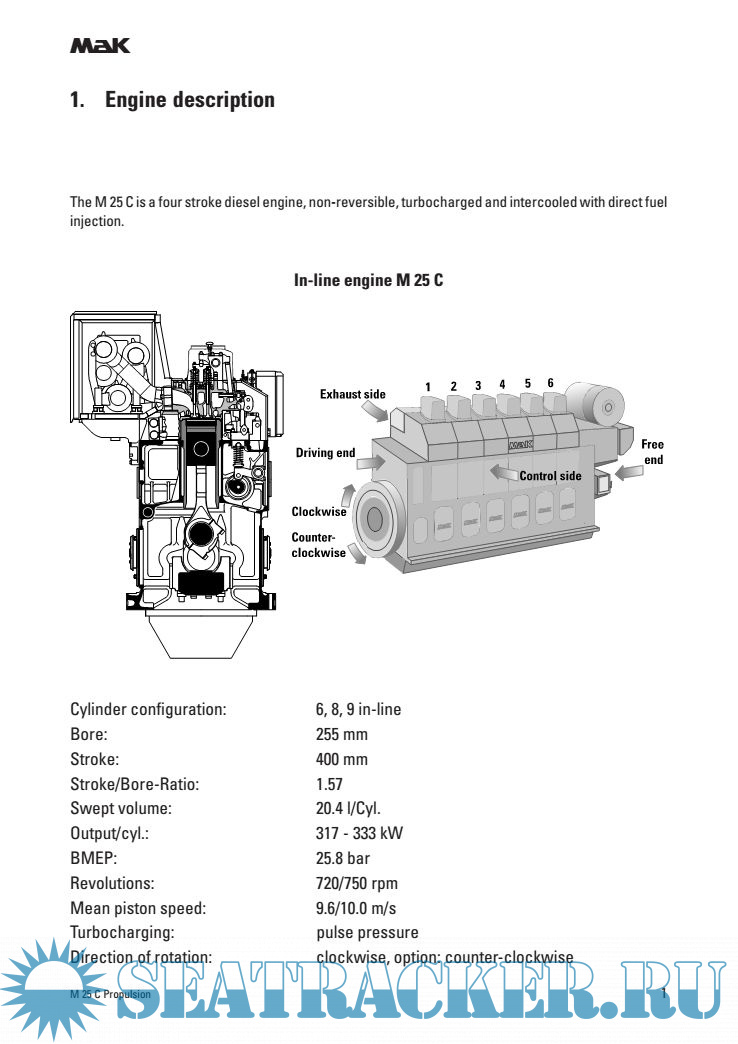Description: Project Guide, Propulsion and description of MaK M 25 C - four stroke diesel engine, non-reversible, turbocharged and intercooled with direct fuel injection.