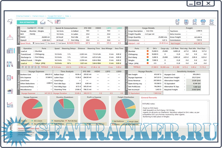 We have chosen to emphasize on combining ease-of-use and practicality with speed, rather than including fields that are far too seldom utilized. Another innovative feature is the inclusion of pie charts that quickly provide a snapshot of crucial information such as the financial distribution of the freight, the duration of the voyage, etc.