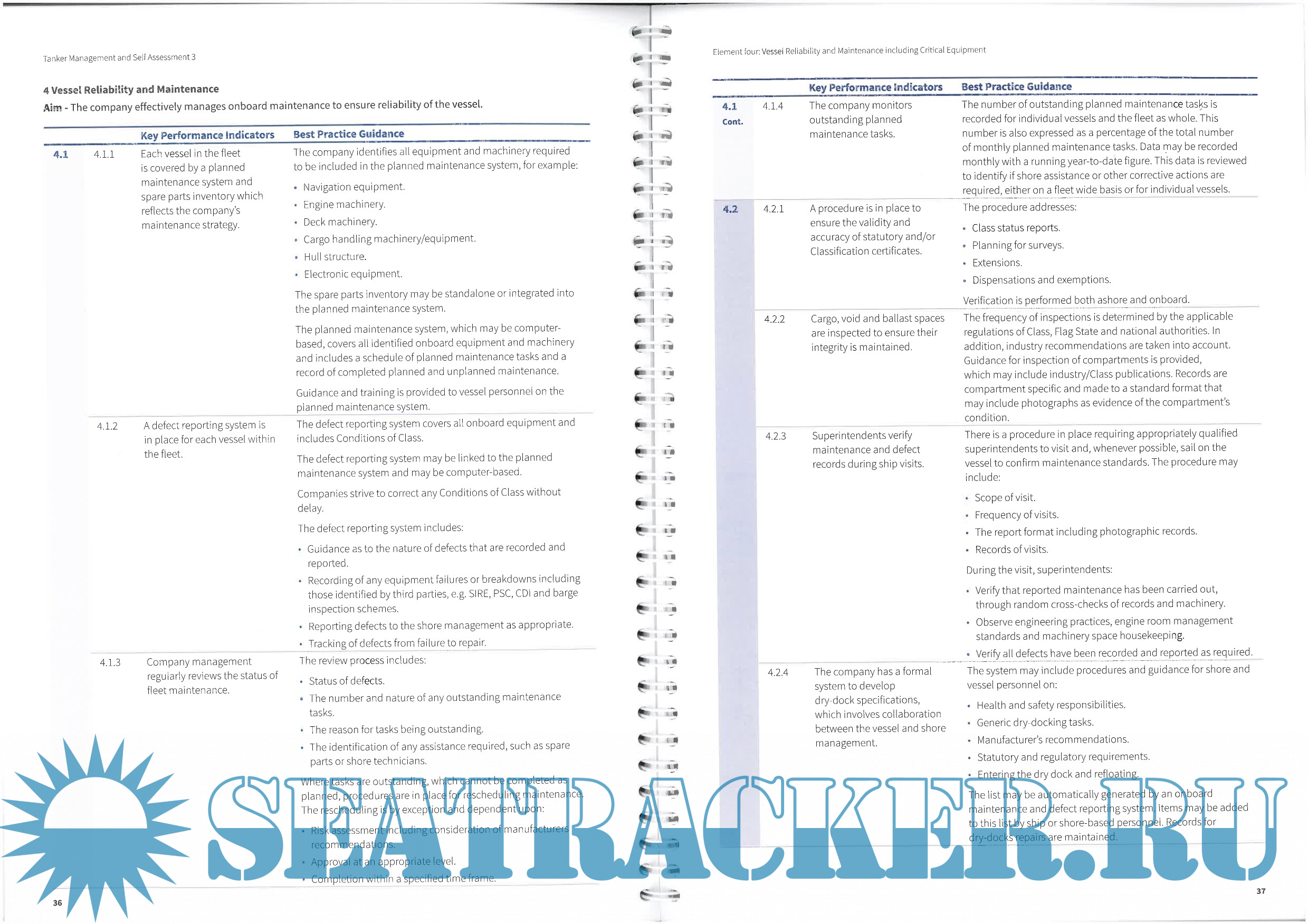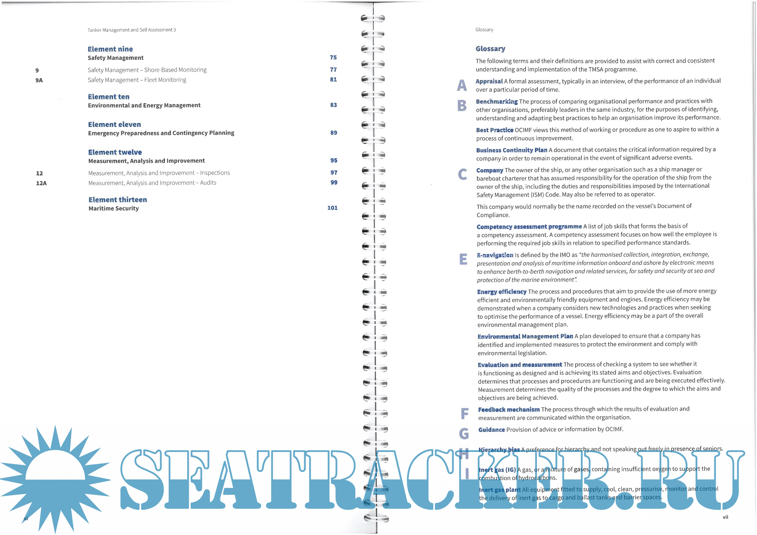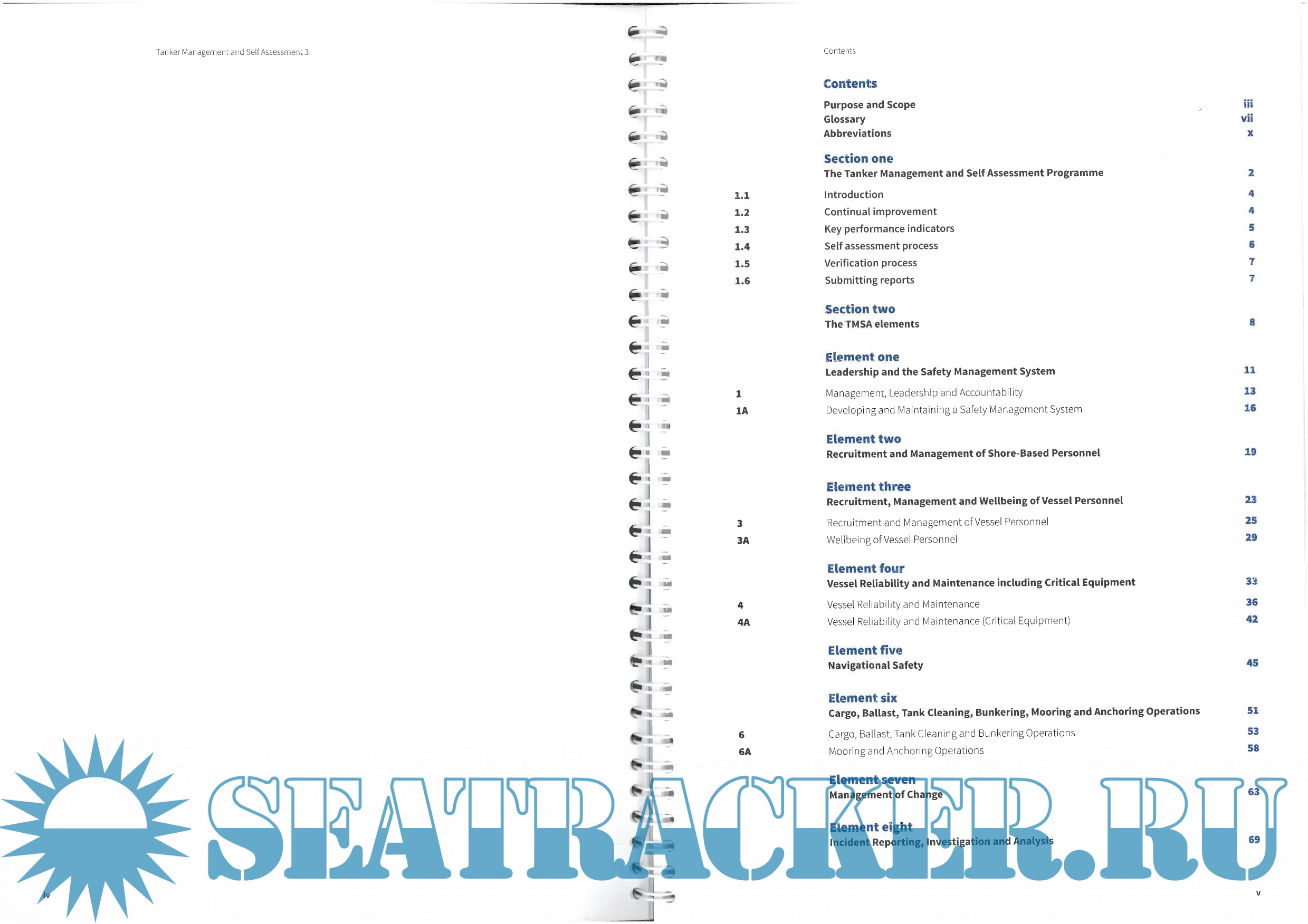 Year: 2017 Language: english Author: OCIMF Publisher: OCIMF Edition: 3rd edition ISBN: 978-1-85609-738-3 Format: PDF Quality: Scanned pages Pages count: 106 Price: €254.95 Description: The OCIMF Tanker Management and Self Assessment (TMSA) programme consists of a book, a matching online tool for recording the self assessment and a database for sharing reports. In February 2017 TMSA was integrated into the Ship Inspection Report Programme (SIRE). The TMSA programme complements IMO Conventions, Codes and Circulars and is intended to encourage self-regulation and promote continuous improvement to enhance the safety of merchant shipping and achieve incident free operations. Implementation of IMO Conventions, Codes and Circulars is achieved by companies establishing an effective safety management system (SMS) covering both ship and shore management processes. An effective SMS is also required for companies to achieve HSSE excellence. The TMSA encourages companies to assess their own SMS against set key performance indicators (KPIs) and provides a minimum expectation (level 1) and three further levels of increasing best practice guidance, which a company may wish to apply in their SMS to improve ship management safety performance. Through self-assessment, companies are encouraged to use ship management assessment results to develop phased improvement plans that can be applied across their entire fleet and to share their TMSA self assessments with potential charterers using the TMSA database. How the TMSA works The TMSA offers a standard framework for assessment of a company’s SMS. It sets out 13 elements of management practice that are essential for the effective management and operation of vessels. Companies can measure their SMS against the KPIs in each element and decide whether they have achieved a particular level in that element and, therefore, provide a clear, objective picture of performance. Importantly, the levels in the TMSA help the company identify gaps in current performance and areas where performance can be enhanced.