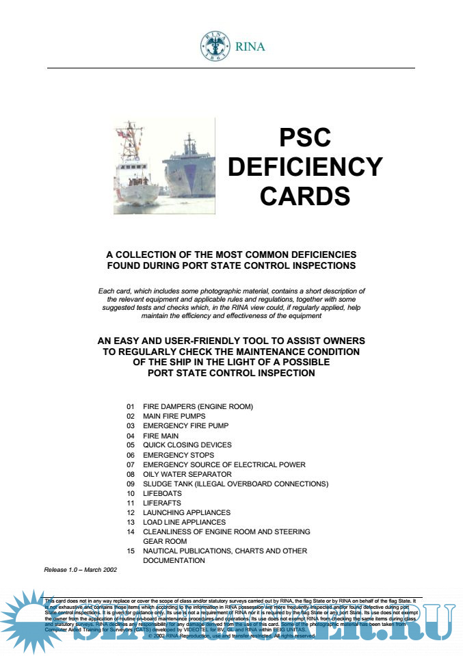 Year: 2002 Language: english Author: RINA Genre: Reference book Publisher: RINA Edition: 1.0 Format: PDF Quality: eBook Pages count: 22 Description: A collection of the most common deficiencies found during PSC inspections. An easy and user-friendly tool to assist owners to regulary check the maintenance condition ofthe ship in the light of a possible PSC inspection.