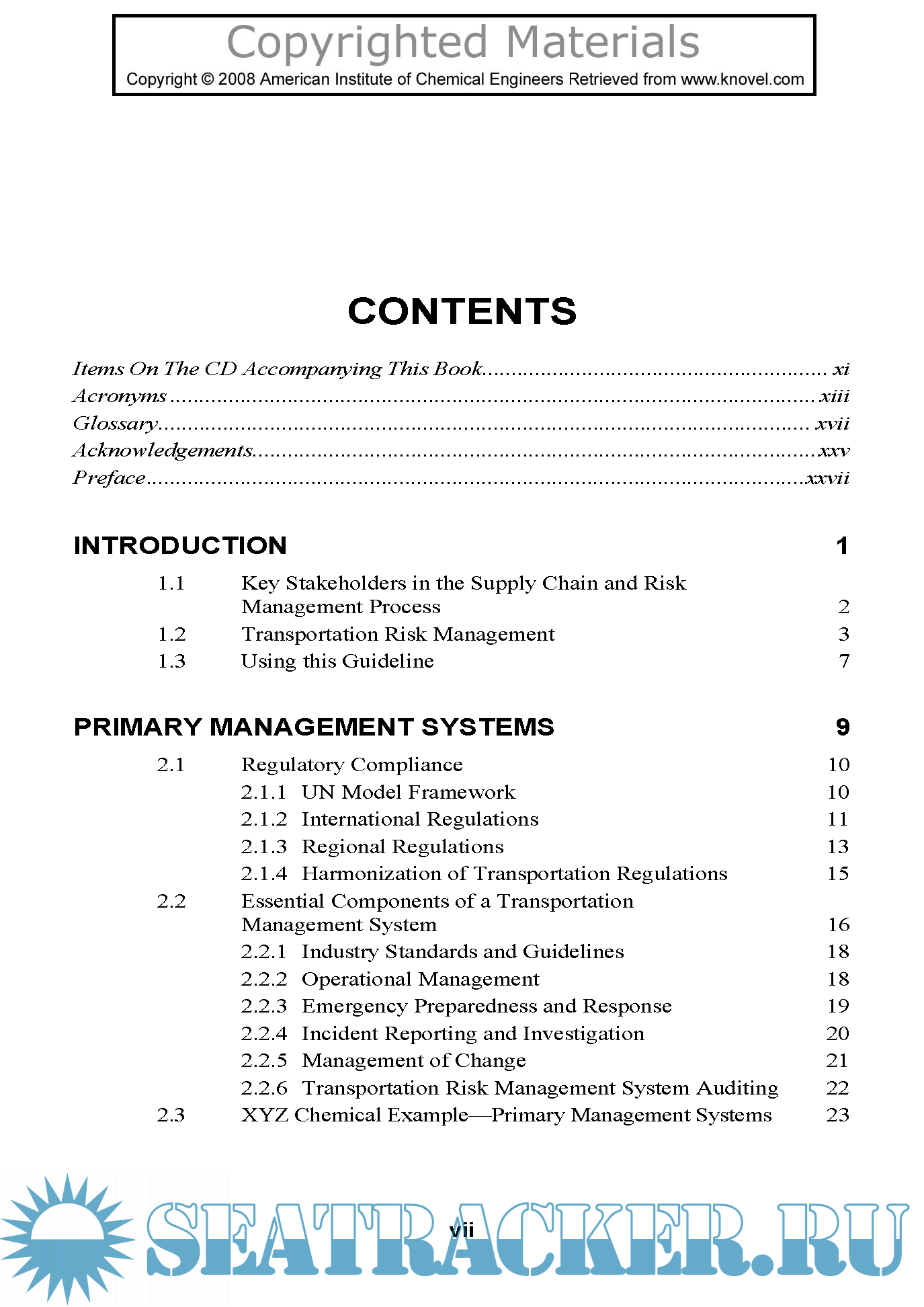 Year: 2008 Language: english Author: American Institute of Chemical Engineers Genre: Guide Format: PDF Quality: Unknown Pages count: 202 Description: The transportation of chemicals and other hazardous materials on roads, railways, waterways, through pipelines, and by other modes and systems provides vital support for today’s economy and standard of living. Global trade has resulted in more transborder shipments of raw materials, consumer products, and hazardous wastes than ever before. The volume of traffic and the speed with which it moves continue to increase in both developed and developing countries, with some transportation systems operating at full capacity, thereby challenging the supporting infrastructure. Urban sprawl and population growth have brought people into closer contact with established transportation corridors, with much of the physical transportation infrastructure carrying both people and industrial shipments. Because the release of a chemical during transit poses a potential risk to surrounding communities, property, and the environment, the transportation of hazardous materials must be carefully managed. It is widely recognized that chemical transportation is more than just a service function that fills a business void; it is a comprehensive system of activities that involves numerous stakeholders with varying backgrounds and interests. Therefore, chemical transportation should address the entire supply chain of a commodity, spanning the delivery and handling of raw materials through the offloading and unpacking of finished products. Additionally, beyond the desire for accident-free chemical transport, the evolving threat of terrorism and other security concerns should be considered as part of a transportation risk management program. Since there may be tradeoffs between safety and security, this balance can challenge even the best business plans and risk management programs.
