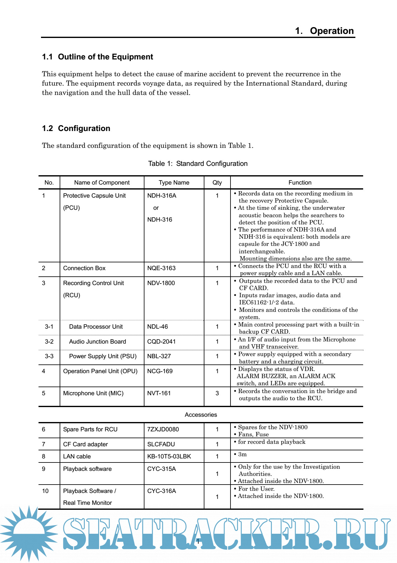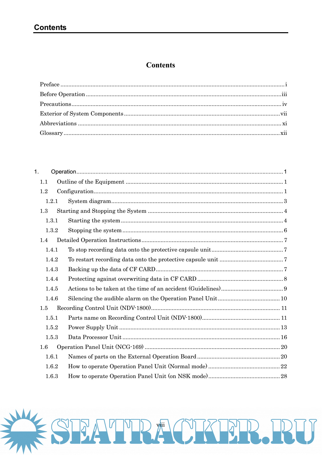 Year: 2008 Language: english Author: JRC Genre: Manual Publisher: JRC Edition: 1 Format: PDF Quality: eBook Pages count: 90 Description: This equipment helps to detect the cause of marine accident to prevent the recurrence in the future. The equipment records voyage data, as required by the International Standard, during the navigation and the hull data of the vessel. If an accident has occurred, it is mandatory to preserve the record data immediately. In case an accident has occurred, please preserve the record data according to the procedure described in 1.4.4: “Actions to be taken at the time of an accident” To ensure the proper operation, we recommend you to read the procedure carefully.