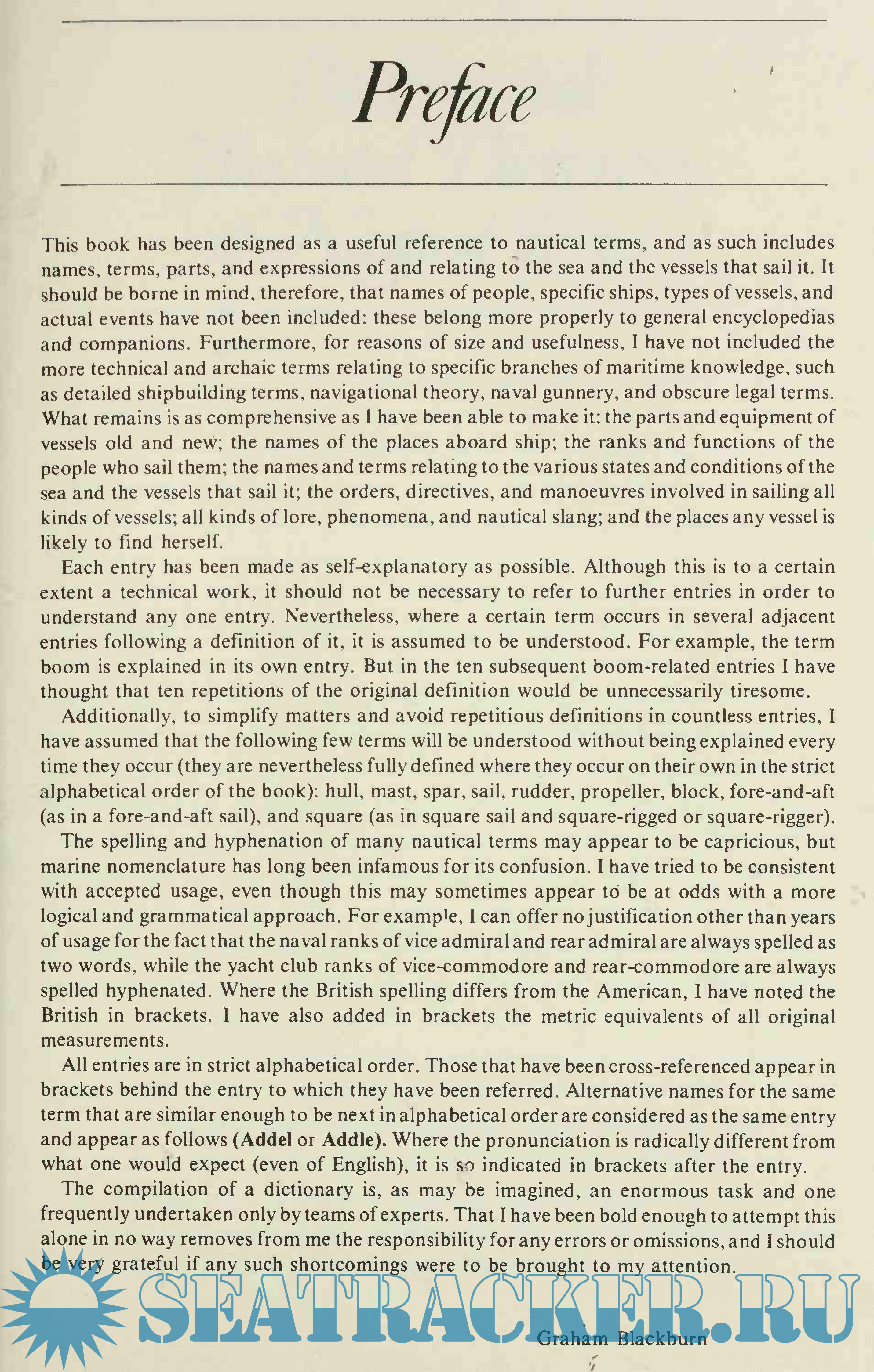 Year: 1981 Language: english Author: Graham Blackburn Genre: Dictionary Publisher: The Overlook Press Edition: 1st ISBN: 0879511249 Format: PDF Quality: Scanned pages Pages count: 372 Description: Here is a useful and profusely illustrated reference to nautical terms with 2500 alphabetical entries, often cross-referenced. Illustrated in Blackburn's original and inimitable style, this dictionary includes names, terms, parts, and expressions of and relating to the sea and the vessels that sail it. Also included are the parts and equipment of water-borne craft, old and new, places aboard ship, the names and terms relating to the various states and conditions of the sea, orders, directives, and maneuvers involved in sailing all kinds of boats, the ranks and functions of the people who sail them, the lore, phenomena, and even the slang used in marine life, as well as the places any vessel is likely to find herself.