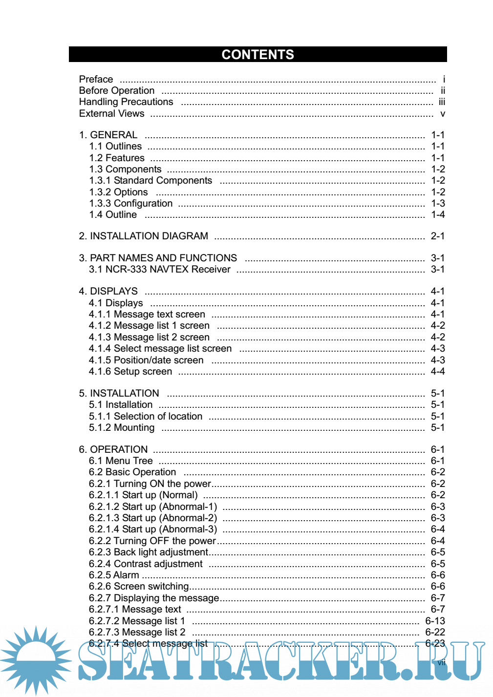 Year: 2013 Language: english Author: JRC Genre: Manual Publisher: JRC Edition: 4 Format: PDF Quality: eBook Pages count: 120 Description: The NAVTEX NCR-333 function receives and displays the various types of information broadcast at frequencies of 518 kHz, 490 kHz and 4209.5 kHz, such as: navigational warning, meteorological warning, search and rescue information, and other types of information. NCR-333 also provides the function that selects information type and coast station for intended uses. Features ● Receiving NAVTEX broadcasts NCR-333 receives NAVTEX broadcasts automatically on 518 kHz, 490 kHz, and 4209.5 kHz. ● Large screen allows comfortable visibility NCR-333 has a 5.7-inch LCD screen display with clear visibility. It also provides three different character sizes of display, and can be selected at your convenience. ● Message saving function NCR-333 can store up to 200 message identification codes for 70 hours. Moreover, the stored message of each channel can be saved up to 50 messages permanently. ● Automatically receiving station setting function NCR-333 can select receiving stations automatically on GPS position data is valid. ● Permanent storage of data settings NCR-333 can set and store the message type and seashore station that receive to internal memory. The data, therefore, does not need to be re-set, even after power has been turned off. ● Dual voltage supply input NCR-333 can be used on wither 24 VDC or 12 VDC vessels. ● Self-diagnosis Function NCR-333 has automatic self-diagnosis function. This function allows easy maintenance and high system reliability. ● Connection to external equipment NCR-333 can be used with the JRC Total Navigator (ECDIS) and external serial printers.
