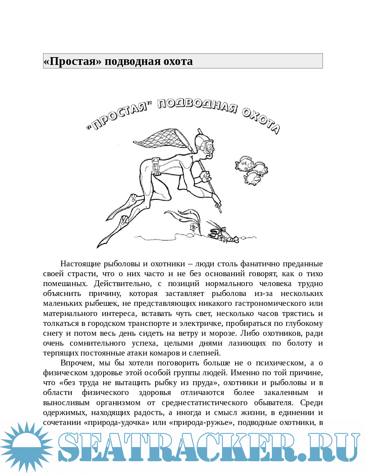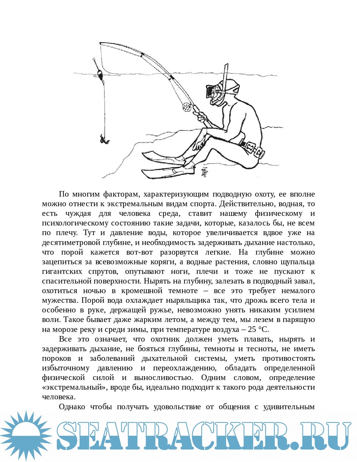Описание: Правила, техника и тонкости подводной охоты в пресных водоемах - речках и озерах России. На огромной территории нашей страны - сотни тысяч рек и озер. Даже, если по показателям прозрачности воды только каждая десятая речка и каждое десятое озеро пригодны для подводной охоты, то получается, что к услугам российских охотников - десятки тысяч больших и малых водоемов. Излагая все тонкости подводной охоты в пресных водоемах, автор рассчитывает, что сумеет помочь любителям в освоении «подводной науки». И благодарит подводных охотников - художника Вячеслава Джишкариани и поэта Анатолия Еременко, оказавших ему бескорыстную помощь в создании этой книги.