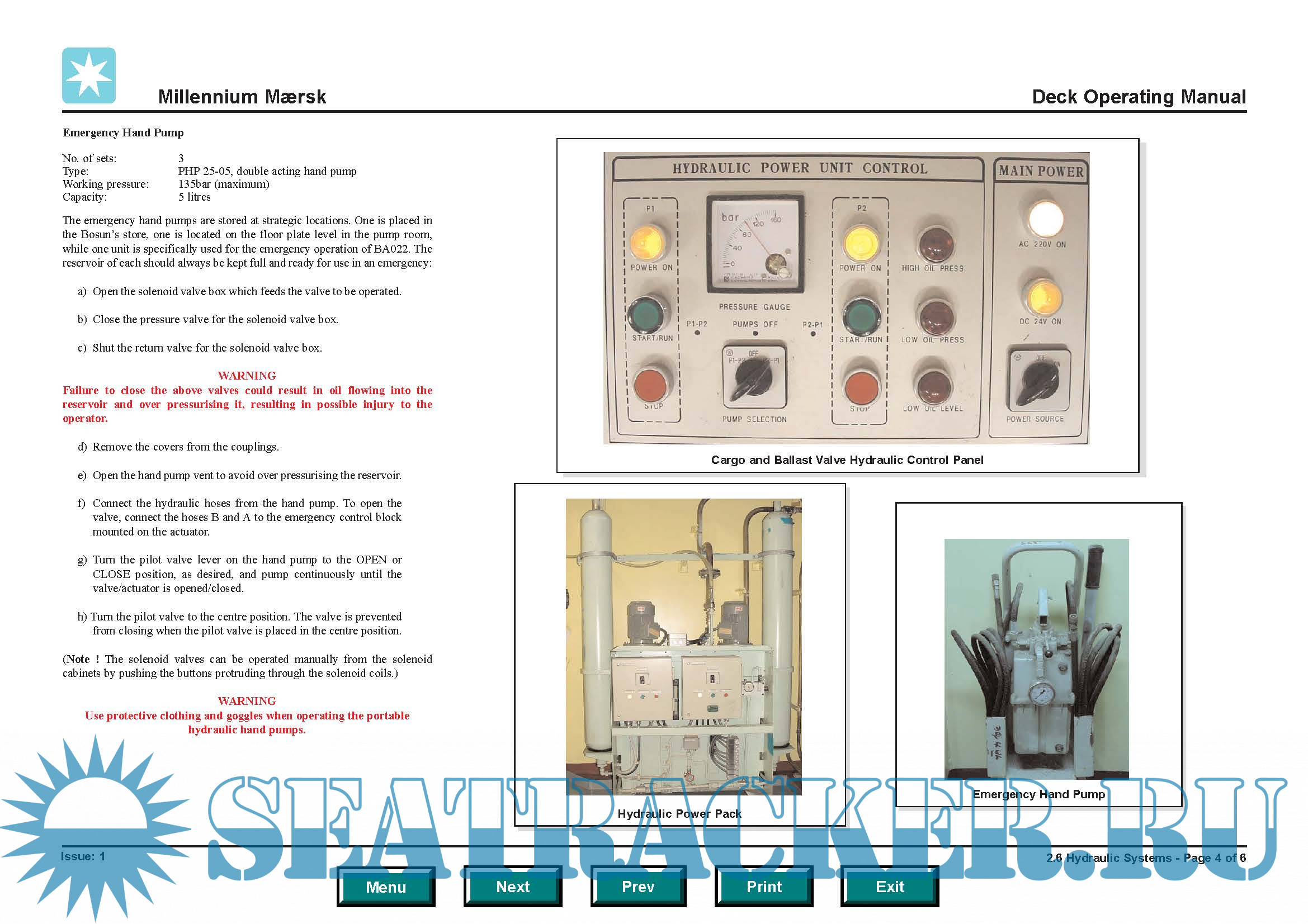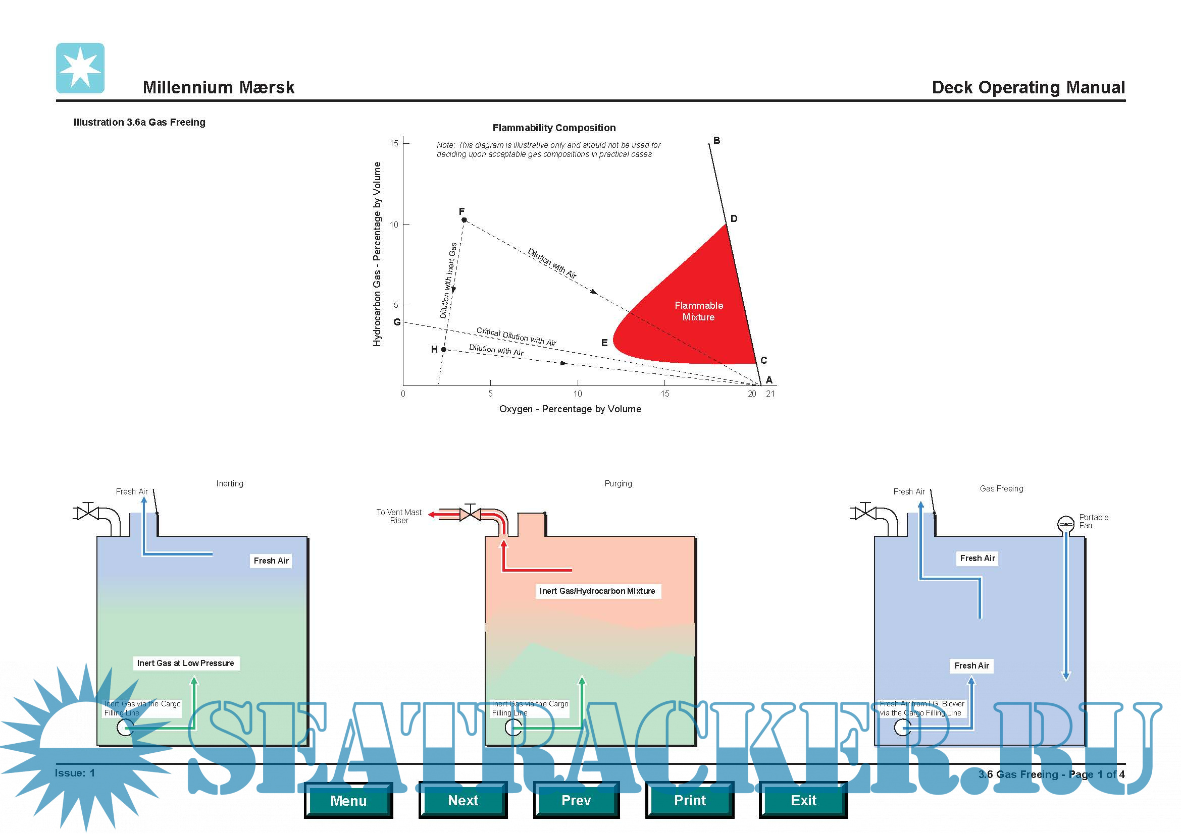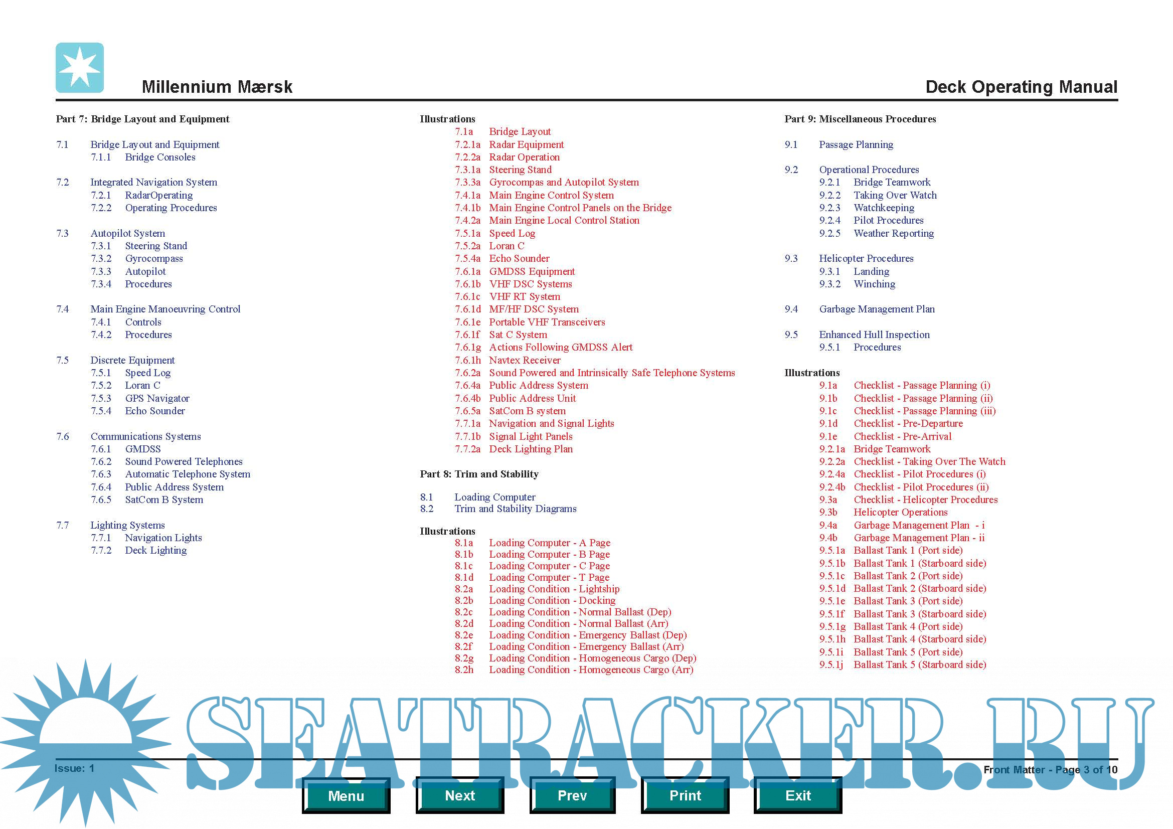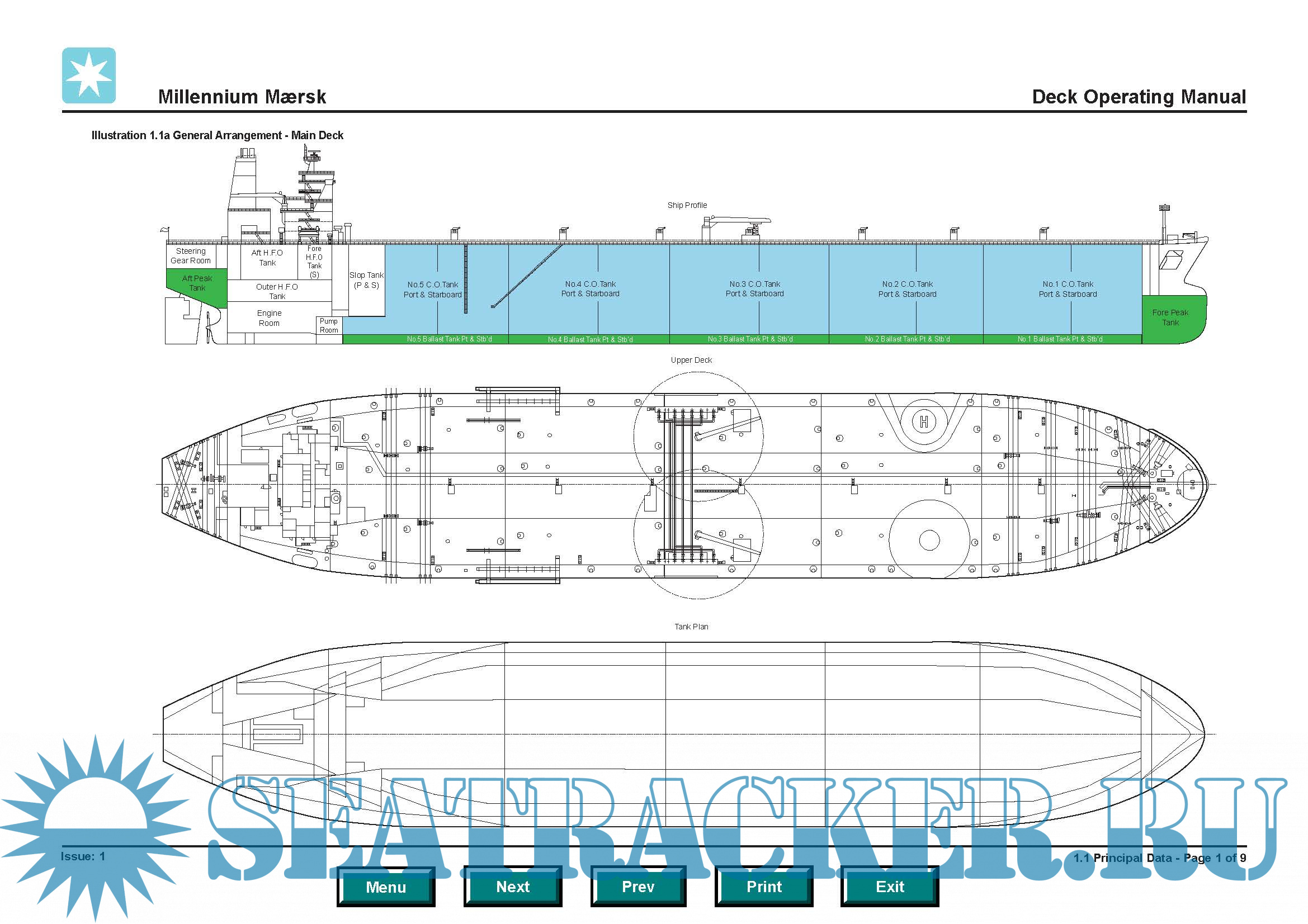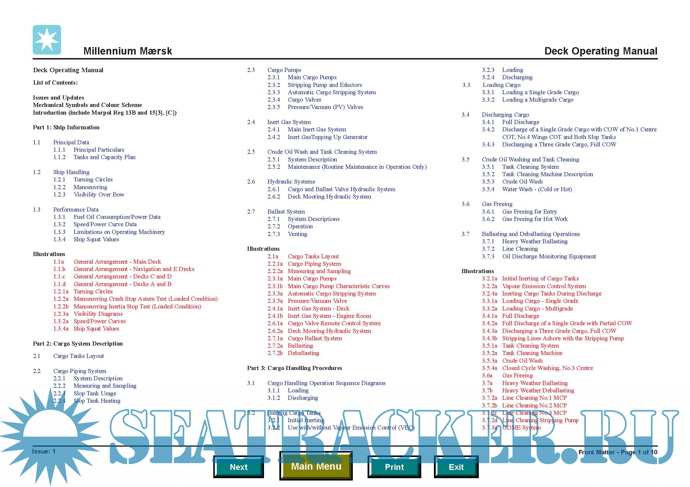 Year: 2000 Language: english Author: Hyundai Heavy Industry Co. Ltd. (HHI), A.P. MOLLER Genre: Documentation Publisher: WORLDWIDE MARINE TECHNOLOGY LTD. Edition: 1st issue Format: PDF Quality: eBook Pages count: 345 Description: The concept of this Deck Operating Manual is based on the presentation of operating procedures in the form of one general sequential chart (algorithm) which gives a step-by-step procedure for performing operations required for the carriage of products. The manual consists of introductory sections which describe the systems and equipment fitted and their method of operation related to a schematic diagram where applicable. This is then followed where required by detailed operating procedures for the system or equipment involved. Each cargo handling operation consists of a detailed introductory section which describes the objectives and methods of performing the operation related to the appropriate flow sheet which shows pipelines in use and directions of flow within the pipelines. A list showing the valves which are OPEN during the different operations is also provided for quick reference. The valve and fitting identifications used in this manual are the same as those used by the shipbuilder. Additional info: http://www.aukevisser.nl/supert...part-4/id521.htm --> Ship info and name changes