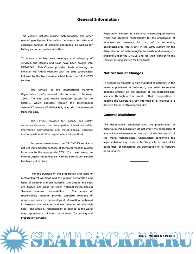 General Information World Map showing limits of WMO Regions Annex I – Index of Stations by METAREA Annex II – List of Stations by country CHAPTER 1 – SAFETYNET SERVICES – THE GLOBAL MARITIME DISTRESS AND SAFETY SYSTEM (GMDSS) - PART A SATELLITE SYSTEMS / COMMUNICATIONS - PART B TERRESTRIAL SYSTEMS METEOROLOGICAL BROADCASTS USING DIGITAL SELECTIVE CALLING (DSC) SYSTEM CHAPTER 2 – MARITIME SAFETY INFORMATION (MSI) BROADCAST SERVICE - PART A SATELLITE SYSTEMS / COMMUNICATIONS - PART B NAVTEX - PART C HF NBDP (Narrow Band Direct Printing) - PART D RADIO-FACSIMILE CHAPTER 3 – VISUAL STORM WARNING SIGNALS CHAPTER 4 FOCAL POINT CONTACT INFORMATION - PART A METAREA Coordinator contacts for WMO Worldwide Met-Ocean information and warning service - PART B Contact points for Ship Weather Routeing Services and Port Meteorological Offices