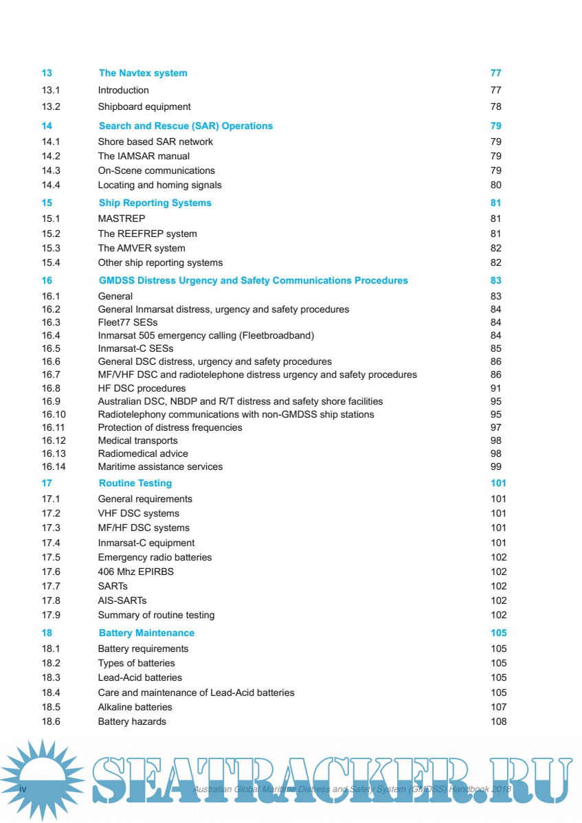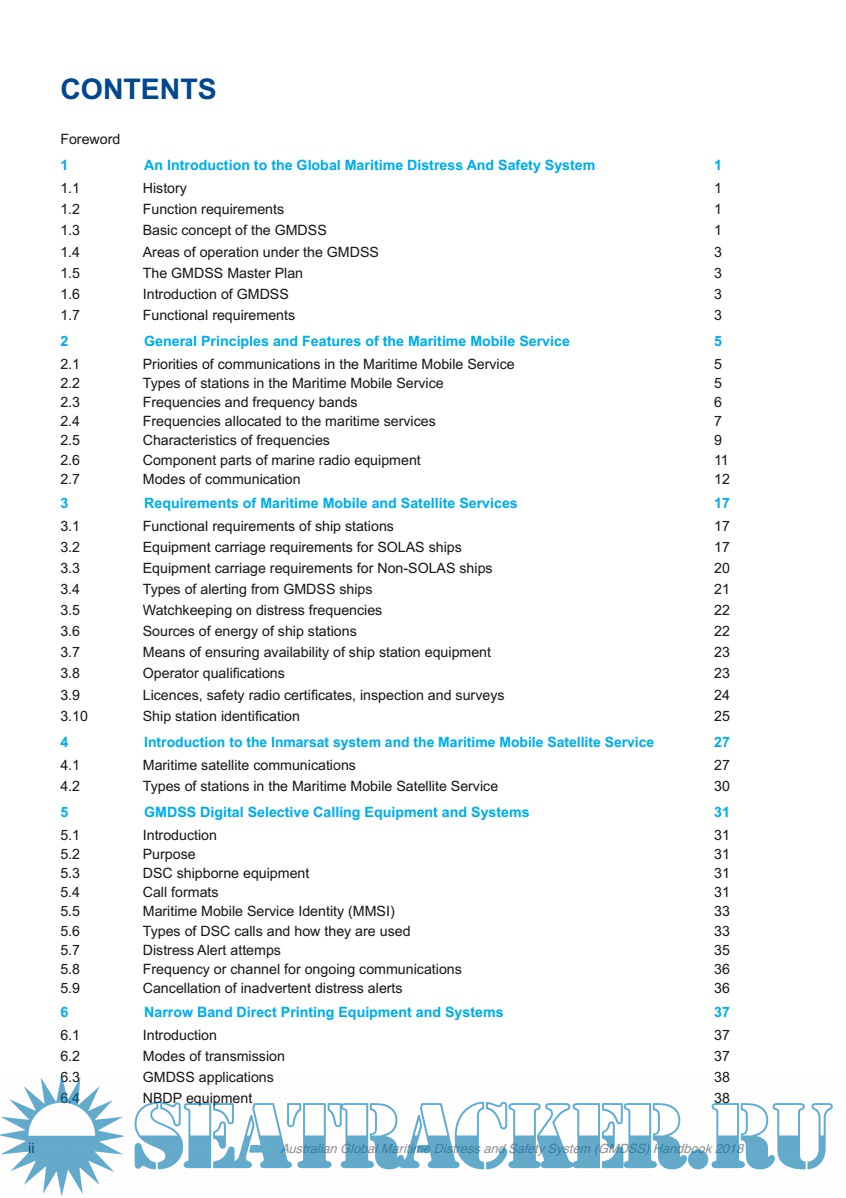 1) An Introduction to the Global Maritime Distress And Safety System 2) General Principles and Features of the Maritime Mobile Service 3) Requirements of Maritime Mobile and Satellite Services 4) Introduction to the Inmarsat system and the Maritime Mobile Satellite Service 5) GMDSS Digital Selective Calling Equipment and Systems 6) Narrow Band Direct Printing Equipment and Systems 7) GMDSS Inmarsat equipment 8) Long Range Identifcation and Tracking (LRIT) 9) GMDSS MF, HF and VHF equipment 10) Emergency Position Indicating Radio Beacons (EPIRBS) 11) Shipborne Automatic Identifcation System (AIS) 12) Survival craft radio equipment 13) The Navtex system 14) Search and Rescue (SAR) Operations 15) Ship Reporting Systems 16) GMDSS Distress Urgency and Safety Communications Procedures 17) Routine Testing 18) Battery Maintenance 19) Equipment Maintenance 20) Routine Communications Procedures 21) Appendices