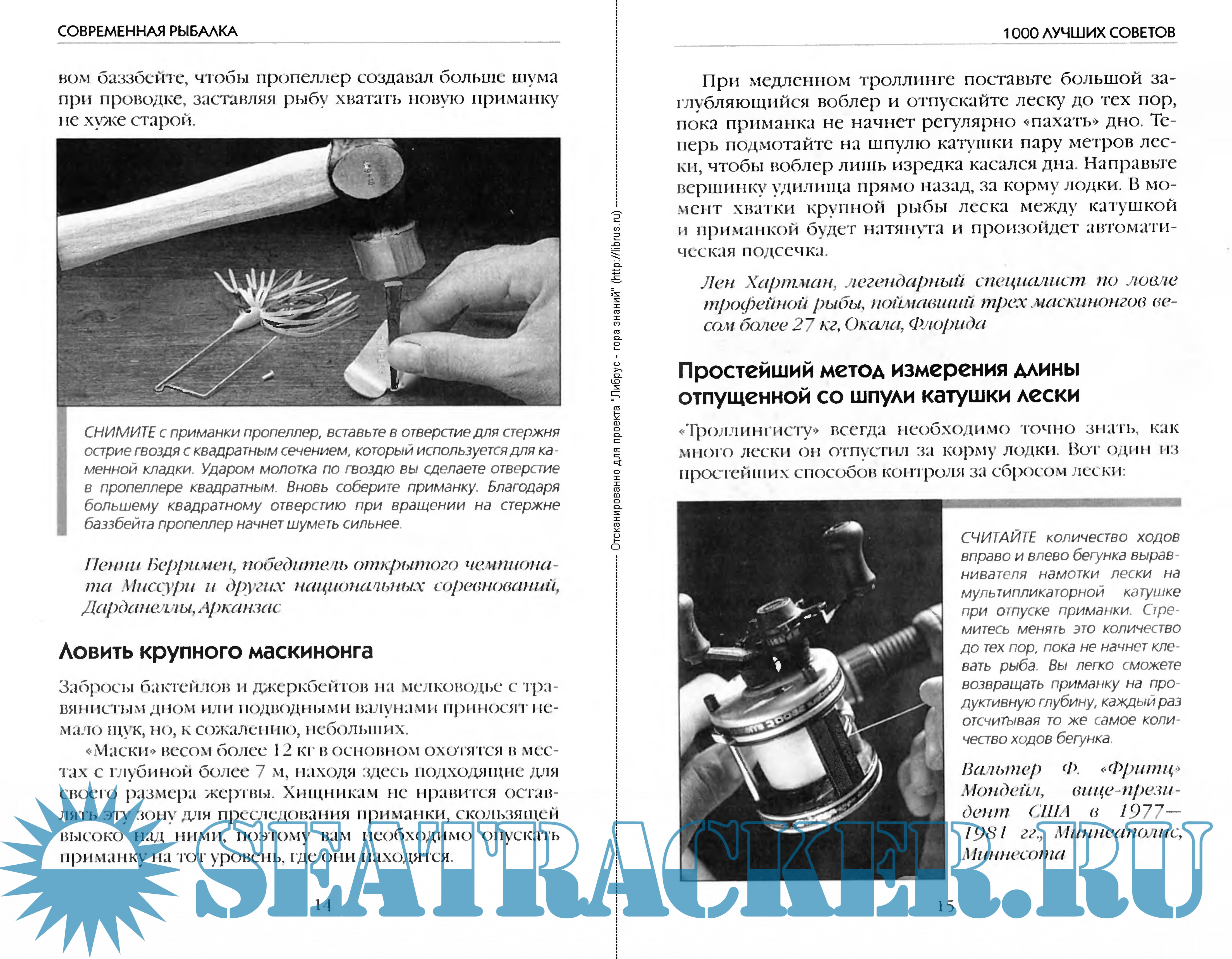 Предисловие переводчика 5 Введение 7 Глава 1. Советы знаменитых рыболовов 10 Глава 2. Общие советы 18 Глава 3. Советы по ловле трофейной рыбы 46 Глава 4. Изготовление и усовершенствование приманок своими руками 134 Глава 5. Советы по снастям 156 Глава 6. Советы по оборудованию 198 Глава 7. После того как рыба поймана 228
