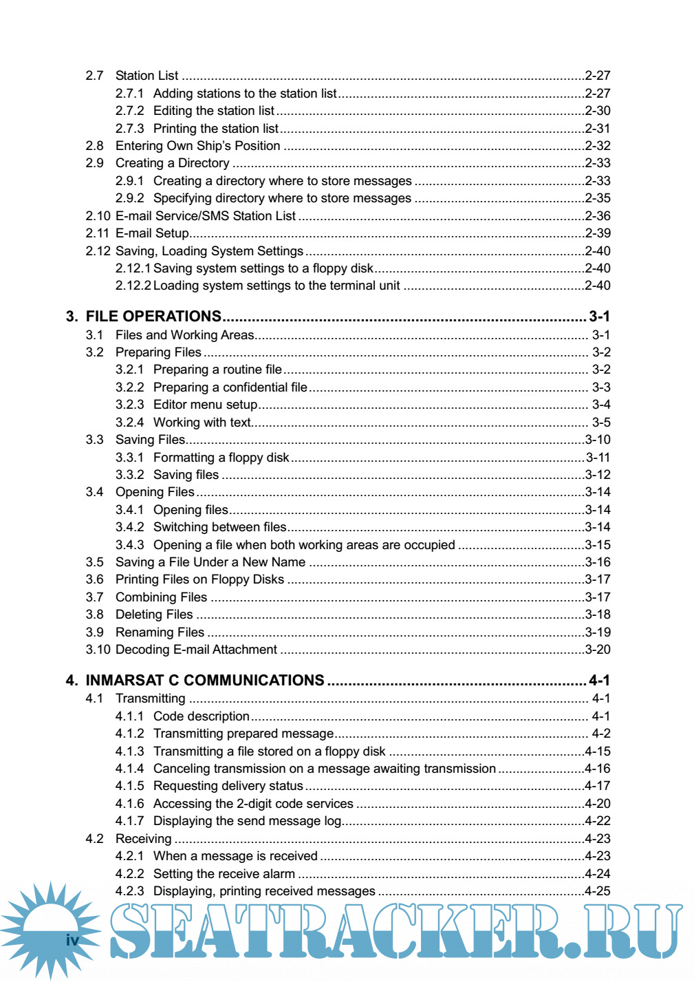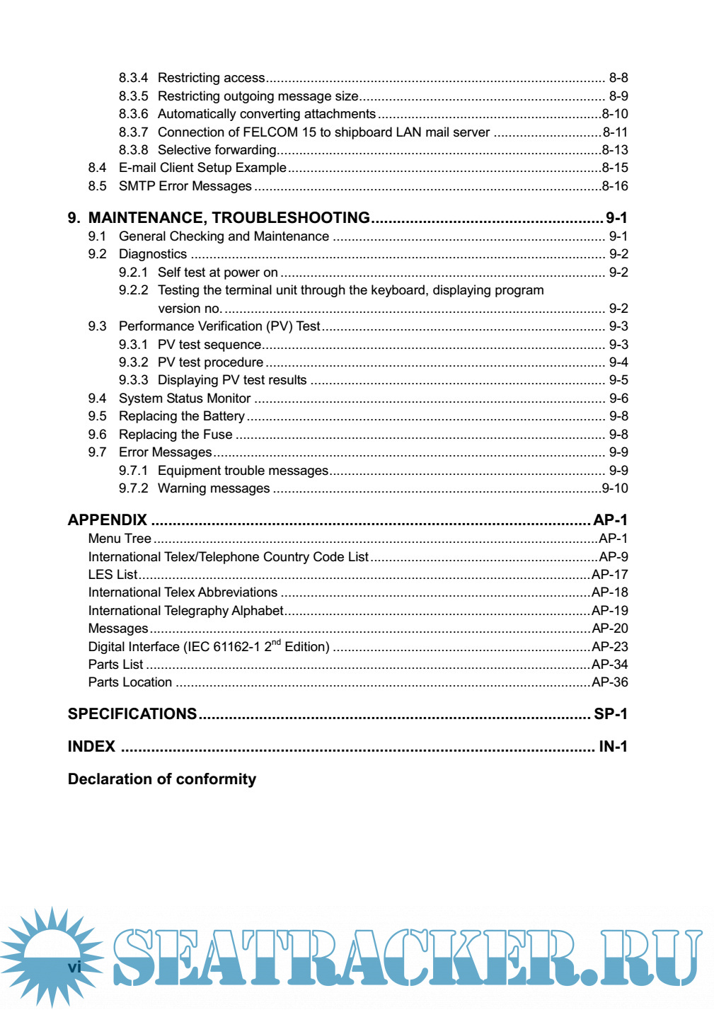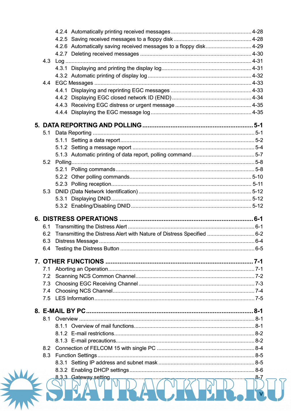 Year: 2009 Language: english Author: Furuno Genre: Manual Publisher: Furuno Edition: K Format: PDF Quality: eBook Pages count: 232 Description: FELCOM 15 provides the full range of distress and general communication services for mobile and fixed terrestrial subscribers in the Inmarsat C communication network. Its compact size permits installation where space is limited. Features • Conforms to the following standards: IMO A.807(19), MSC.68(68) Annex 4, MSC/Cir 682, IMO A.694(17), IEC 61097-4 (1994), IMO A.664(16), IEC 60945 (2002), IEC 61162-1 (2000). • E-mail facility. (To send E-mail, register with an LES which provides e-mail services.) • Built-in Enhanced Group Call (EGC) receiver permits operation as EGC-only receiver. • Terminal unit accepts a wide variety of peripheral equipment: Distress Message Controller (DMC), PC, navigator, etc. • Connection of external terminal unit for operation from remote location such as the bridge. • Store-and-forward telex communication (public telex network) • Data reporting and Polling • GPS receiver (option) built in the terminal unit provides GPS-generated position. • Diagnostic programs for maintenance • Terminal unit provides a floppy disk drive for storage of received and transmitted messages on floppy disks. • Menu driven operation