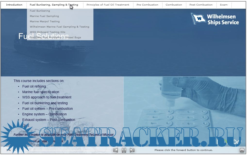 Year: 2013 Language: english Author: Wilhelmsen Ship Service Genre: Интерактивный обучающий курс + тест Publisher: Wilhelmsen Format: swf Description: 25 минутный обучающий курс на английском языке с последущей проверкой знаний Additional info: Необходим Adobe Flash Player; Для начала курса запустить start.exe файл; В поле login необходимо что-нибудь ввести, нельзя оставлять это поле пустым; Для запуска нажать на зеленый кубик слева под названием курса
