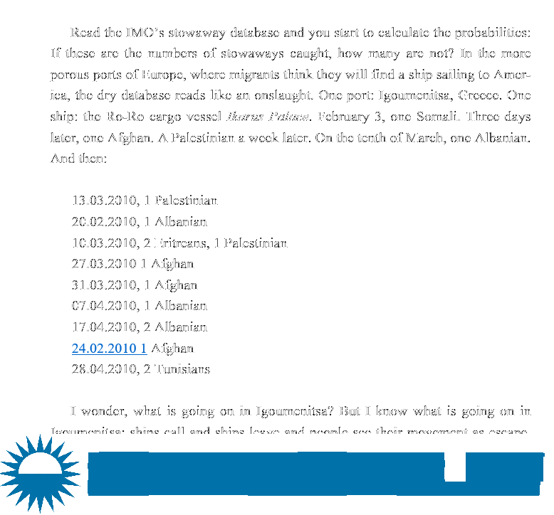 In 2010 George was writer-in-residence with Maersk Line, sailing on Maersk Kendal (LOA 299 m; 6,500 TEU; UK-flagged) from Felixstowe to Port Klang. She also spent a week on Portuguese frigate Vasco da Gama (LOA 142 m; 100 mm cannon, plus missiles and torpedoes) on anti-pirate duty and talked to the Mission to Seafarers in Immingham and the International Transport Workers Federation (ITF) at Birkenhead.