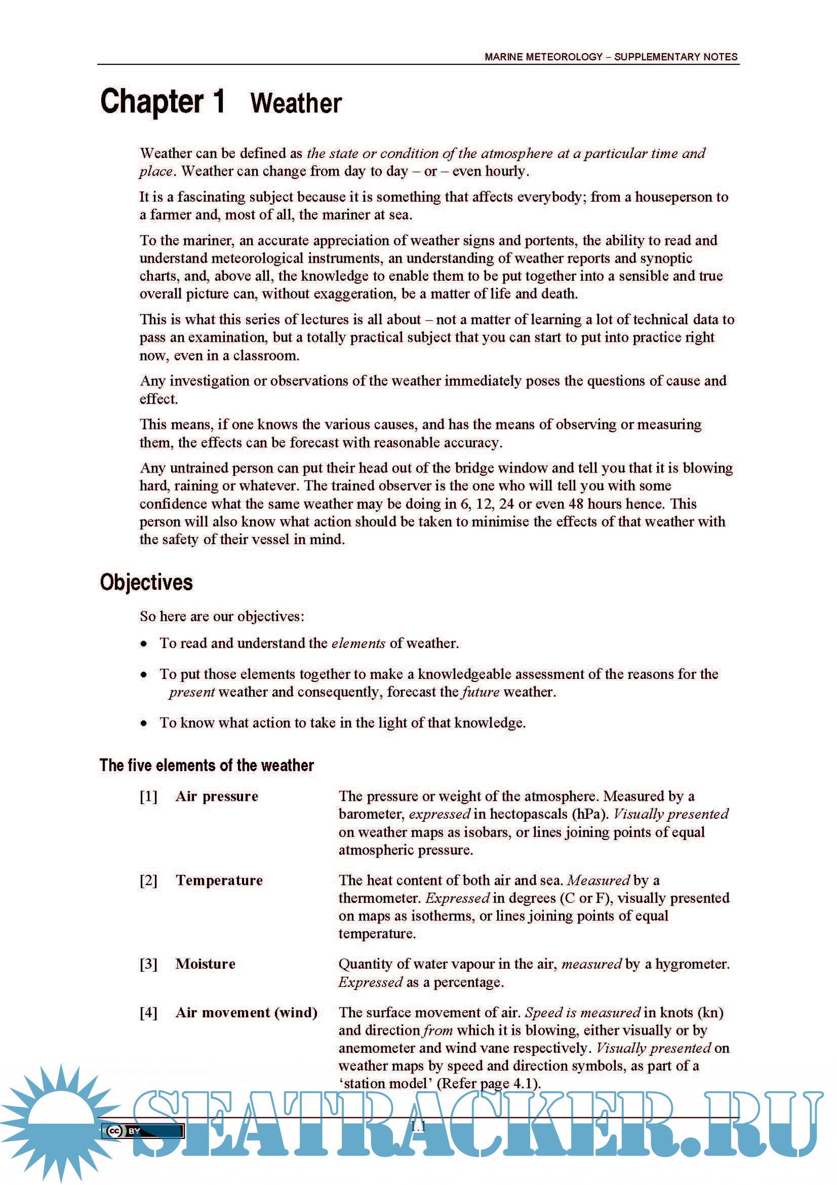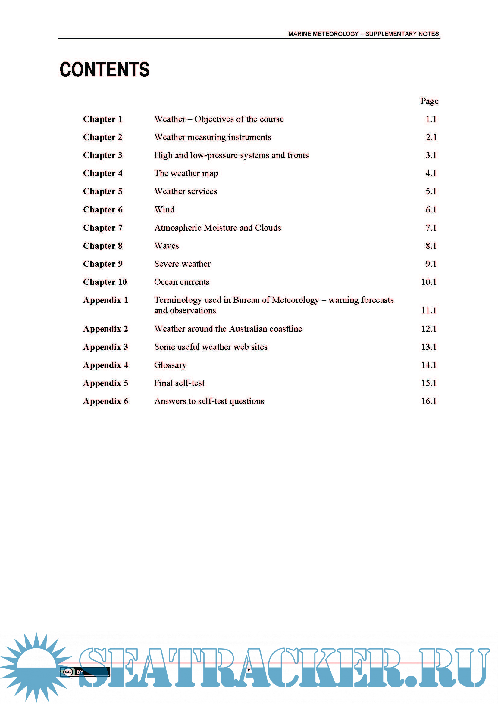 Description: This resource covers the required content for meteorology for all levels from Coxswain to Master 4 level. Topics include: weather - objectives of the course; weather measuring instruments; high and low-pressure systems and fronts; the weather map; weather services; wind; atmospheric moisture and clouds; waves; severe weather; ocean currents, etc.