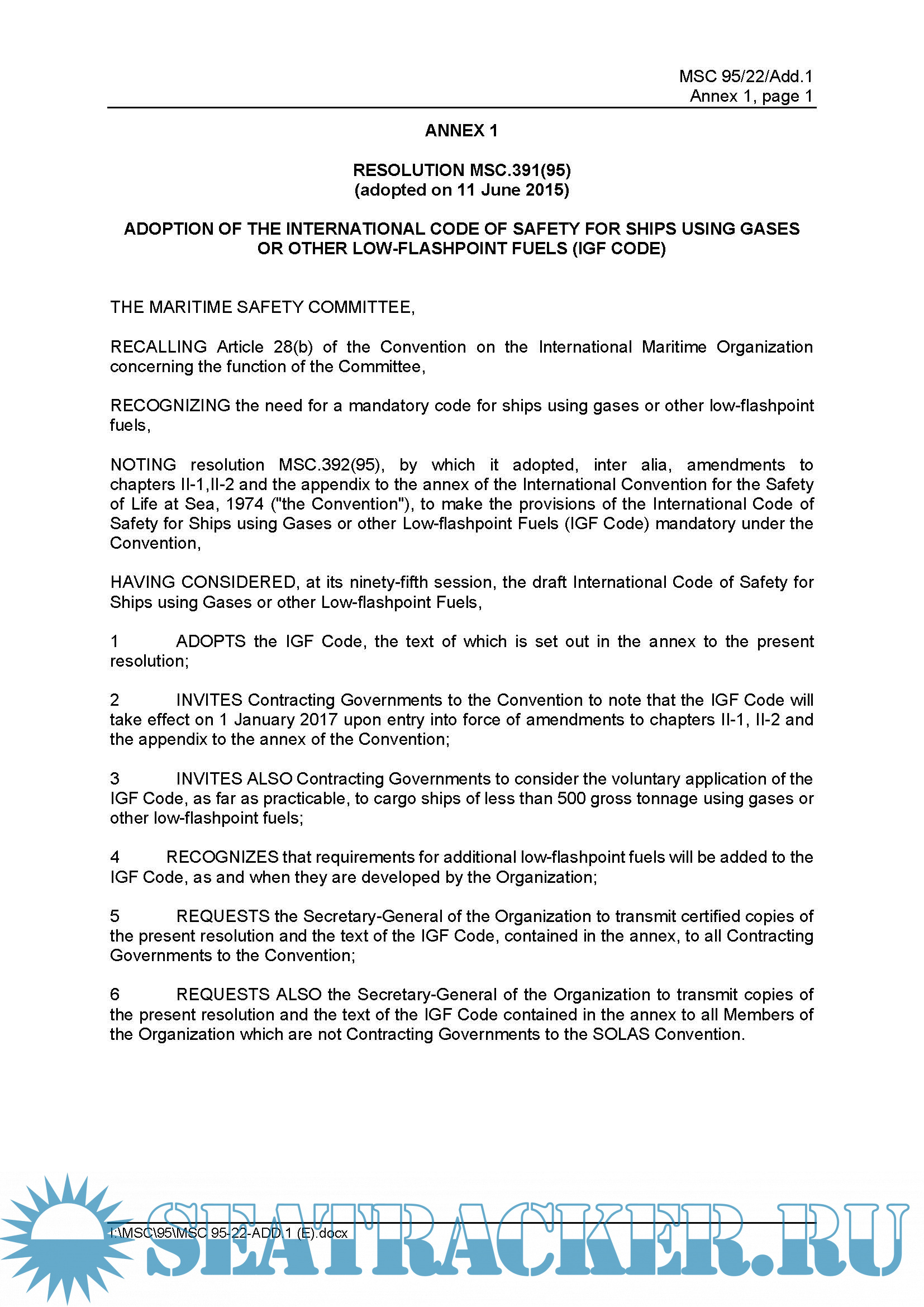 Description: IMO RESOLUTION MSC.391(95) (adopted on 11 June 2015) ADOPTION OF THE INTERNATIONAL CODE OF SAFETY FOR SHIPS USING GASES OR OTHER LOW-FLASHPOINT FUELS (IGF CODE)