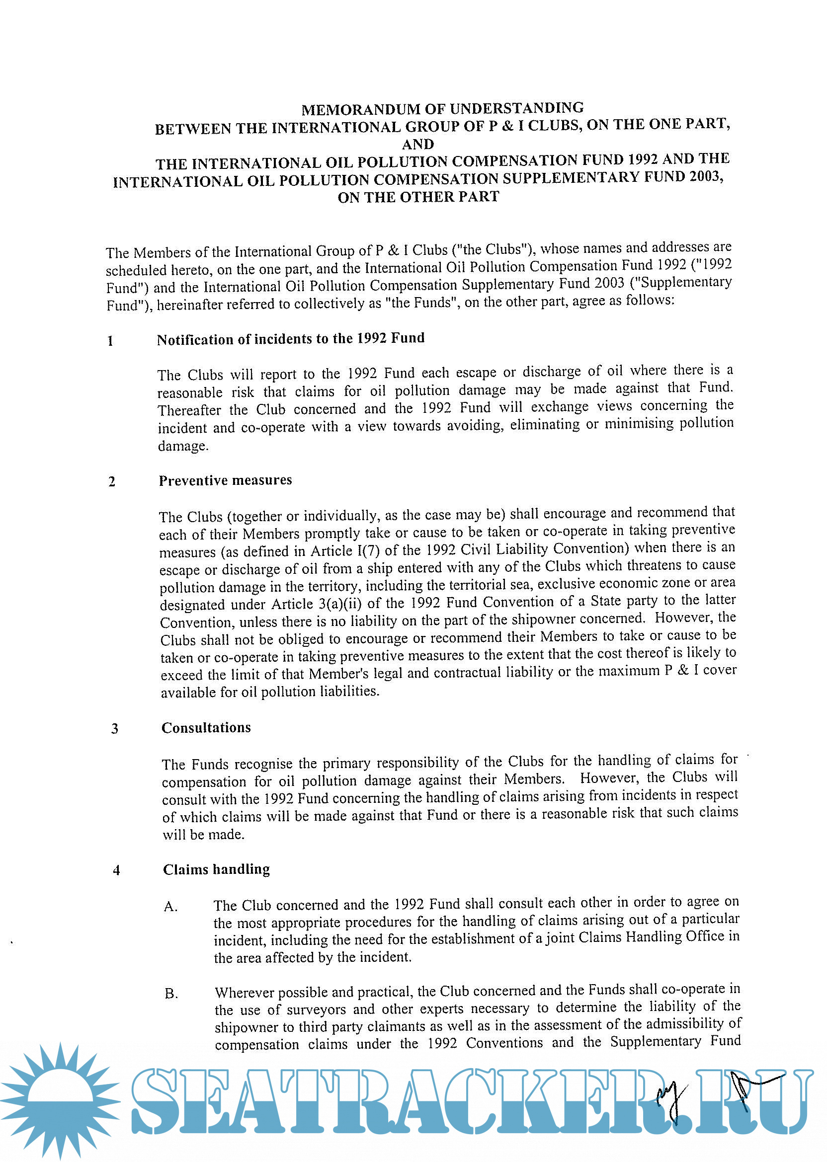 Memorandum Of Understanding between the International Group of P & I clubs, on the one part, and the International Oil Pollution Compensation Fund 1992 and the International Oil Pollution Compensation Supplementary Fund 2003, on the other part (8 Pages) combined in one pdf file of 33 pages