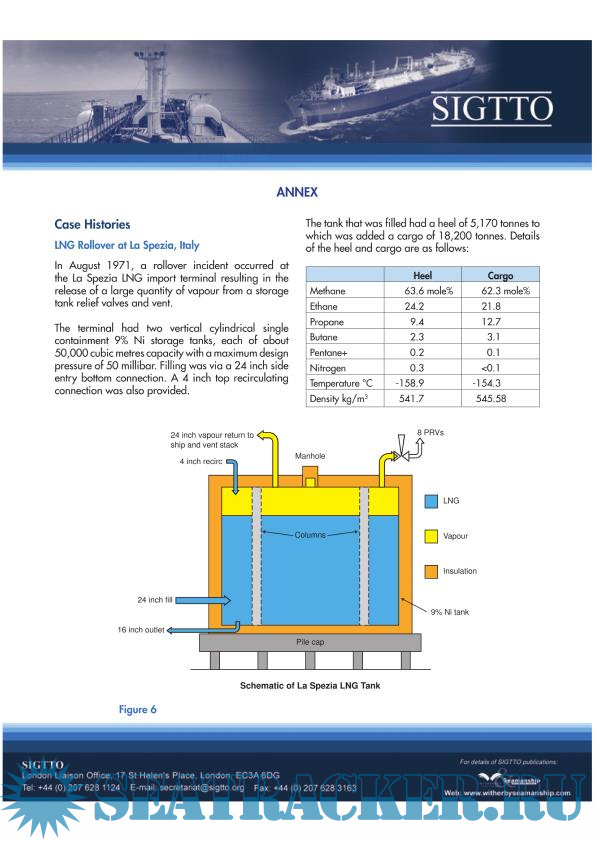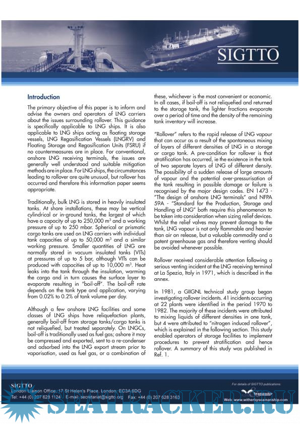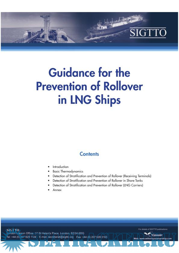 Year: 2012 Language: english Author: SIGTTO Publisher: Witherby Издание: 1 ISBN: 978-1-85609-558-7 Format: PDF Quality: eBook Number of pages: 14 Description: This guidance was produced by SIGTTO to members' concerns about the some of the interpretations of the functional requirements for emergency shutdown systems; in particular, differences between the needs of the liquid natural gases industry and those of liquid petroleum gases industry. It was also aimed to encourage and promote the use of linked emergency shutdown systems at both LPG and LNG terminals, especially where cargo transfer rates are quite high or where they handle one of the cargoes stated in IGC Code 1993/Chapter 17. However, this SIGTTO publication is not intended to contradict any international or national requirements or standards for operational practices at the liquefied gas ship-shore interface. One of the primary objectives of this guidance was to advise the operators/owners of gas carriers about the rollover-related issues. The rollover itself mainly refers to the quick release if the LNG vapor occurring when the layers of different densities of LNG are spontaneously mixed in a cargo or storage tank. While for the conventional onshore terminals all such issues are known and understood, for LNG vessels the associated circumstances are a bit unusual and have to be paid serious additional attention...