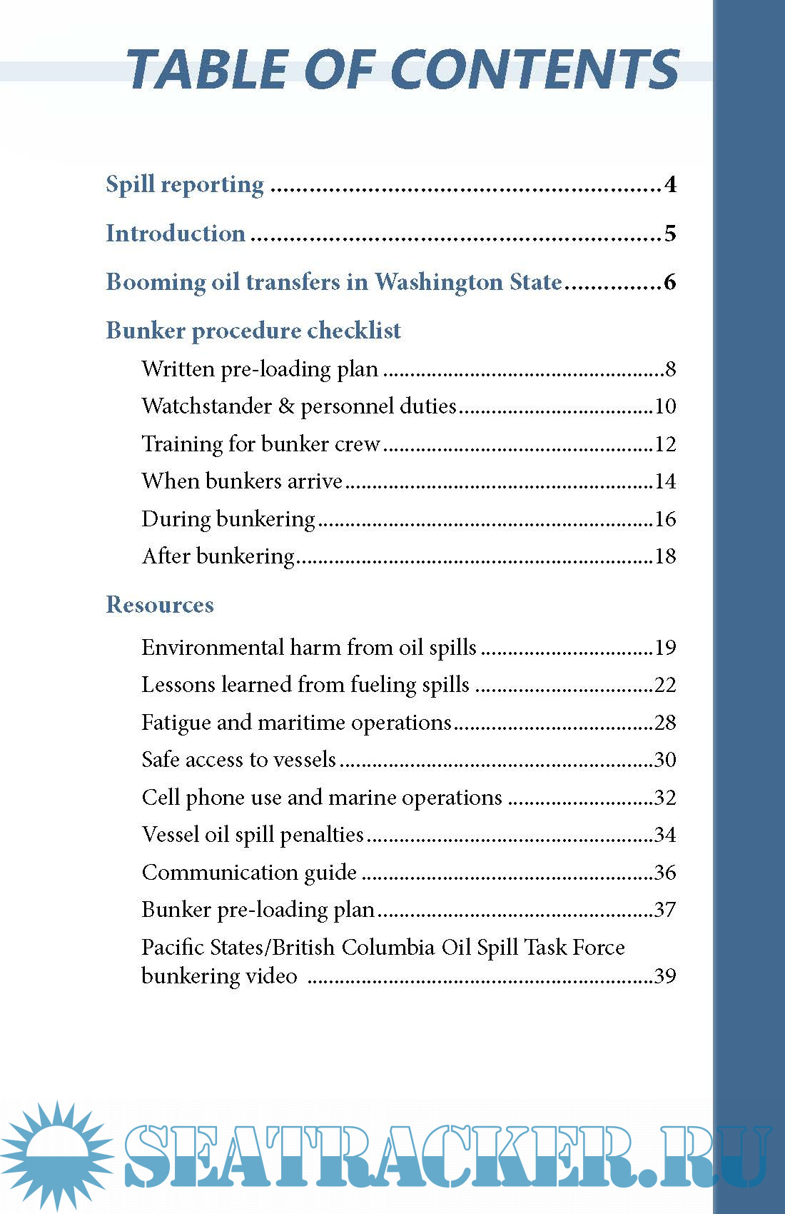 Year: 2014 Language: english Author: Sarah Thompson, Mike Lynch, Pacific States/British Columbia Oil Spill Task Force Genre: Manual Publisher: Department of Ecology State of Washington Edition: June 2017 Format: PDF Quality: eBook Pages count: 40 Description: This Bunkering Best Practices manual contains tips and best practices that can help you prevent oil spills and protect Washington’s environment, public health, safety, and economy. We encourage you to use this guide to develop your bunkering policies and train your crew in safe and effective practices. By using responsible oil transfer procedures, you can greatly reduce costly and dangerous spill incidents. The Washington State Department of Ecology regulates oil transfers over Washington waters to help prevent oil spills. The bunkering best practices checklists in this guide comply with the Washington State bunkering rule (Chapter 317-40 WAC). The checklists include the experience and knowledge of our spill prevention inspectors. Our inspectors have conducted and observed thousands of bunkering operations and reviewed many more vessel oil transfer/bunkering procedures. The practices highlighted in this manual are meant to create a spill prevention mindset during your bunkering operations. They do not replace your vessel’s procedures or the federal oil transfer requirements of the U.S. Coast Guard. Additional info: A video related to this manual can be downloaded from